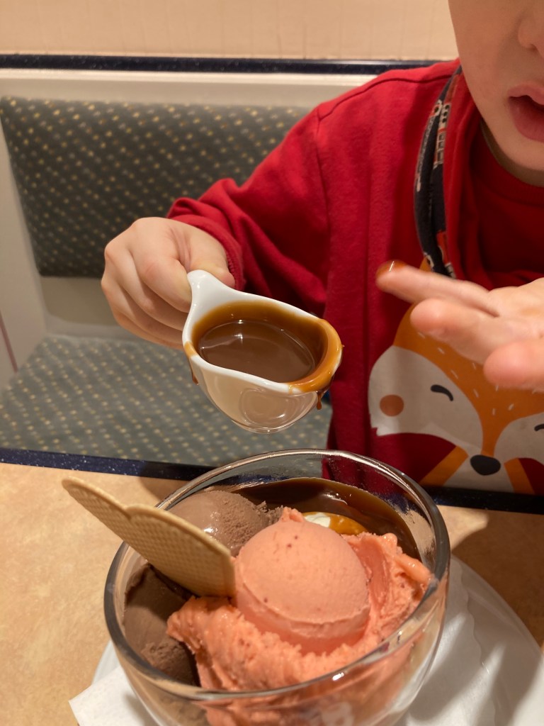 [Etwas später. KJ:] „Ich nehme … Schoko, Vanille, Erdbeer. Und Schokosauce. Und einen Kakao.“