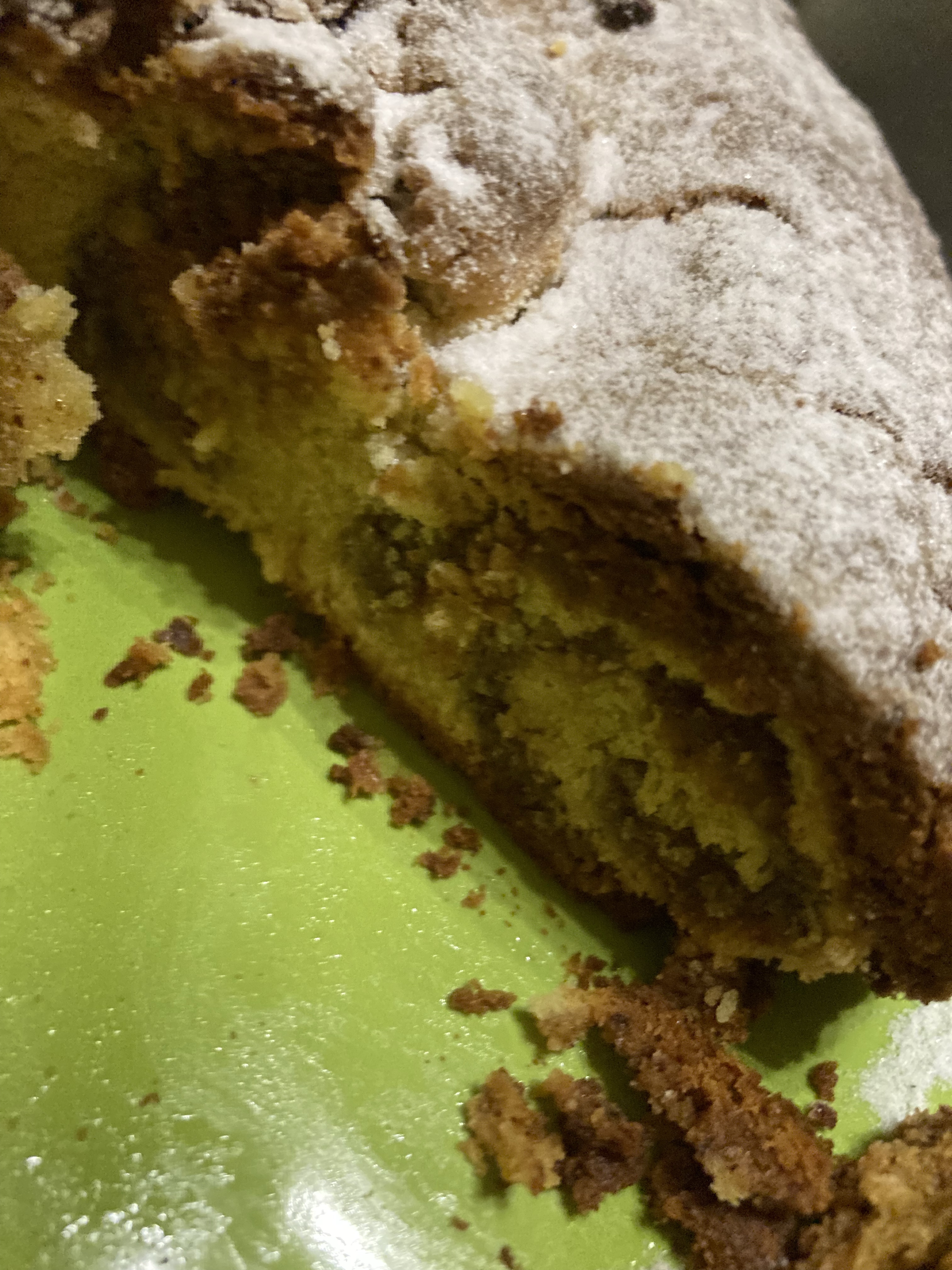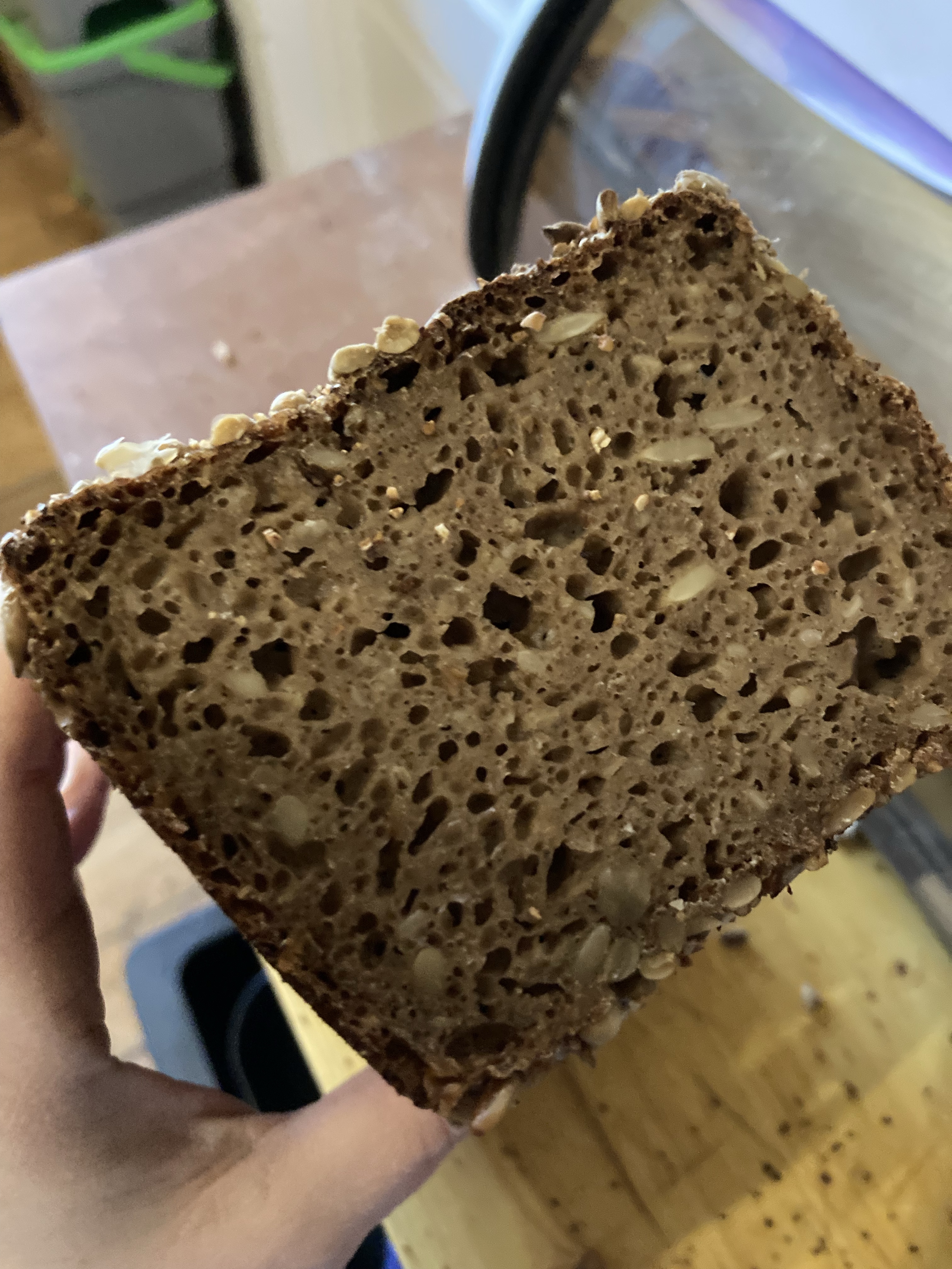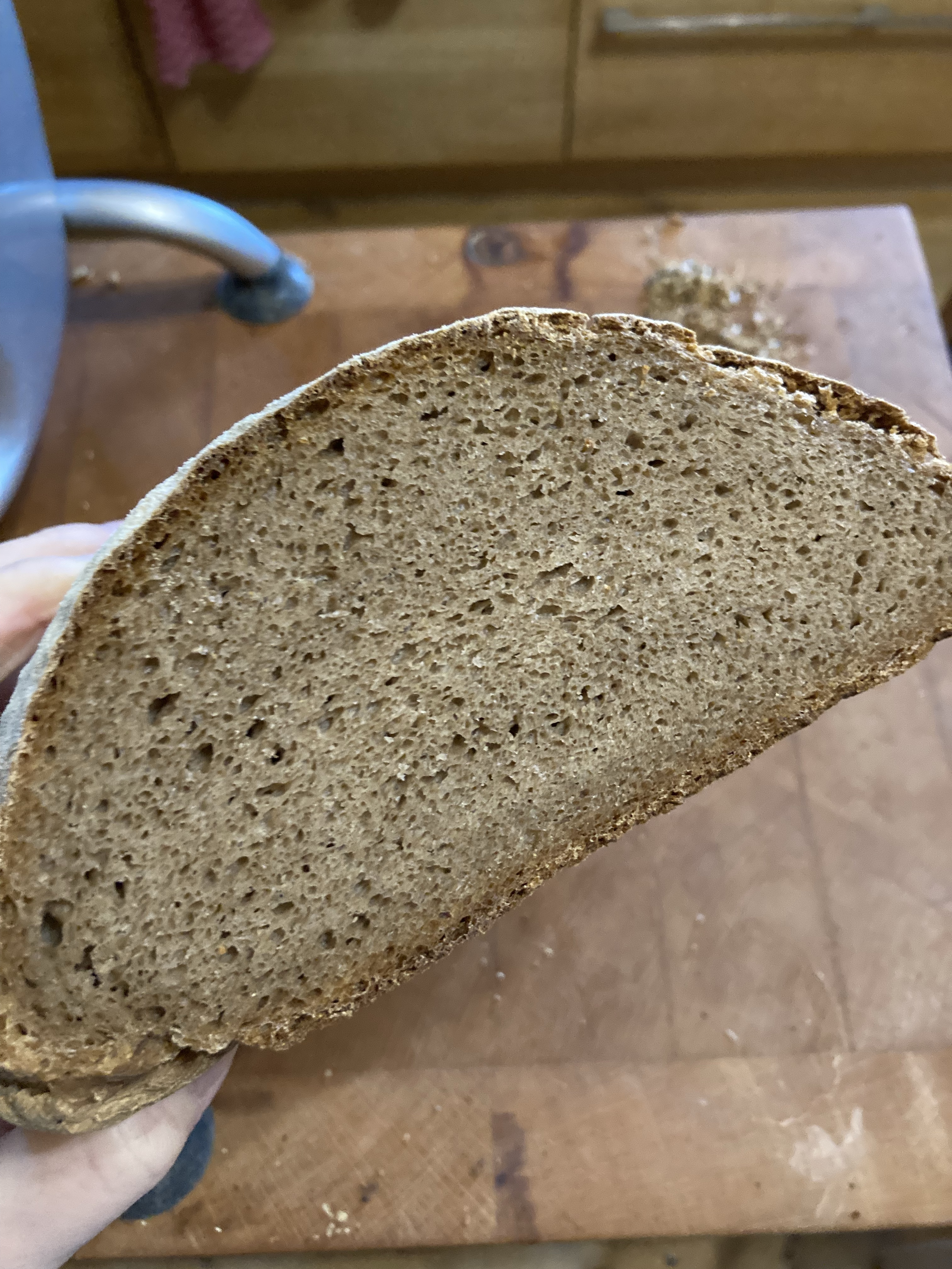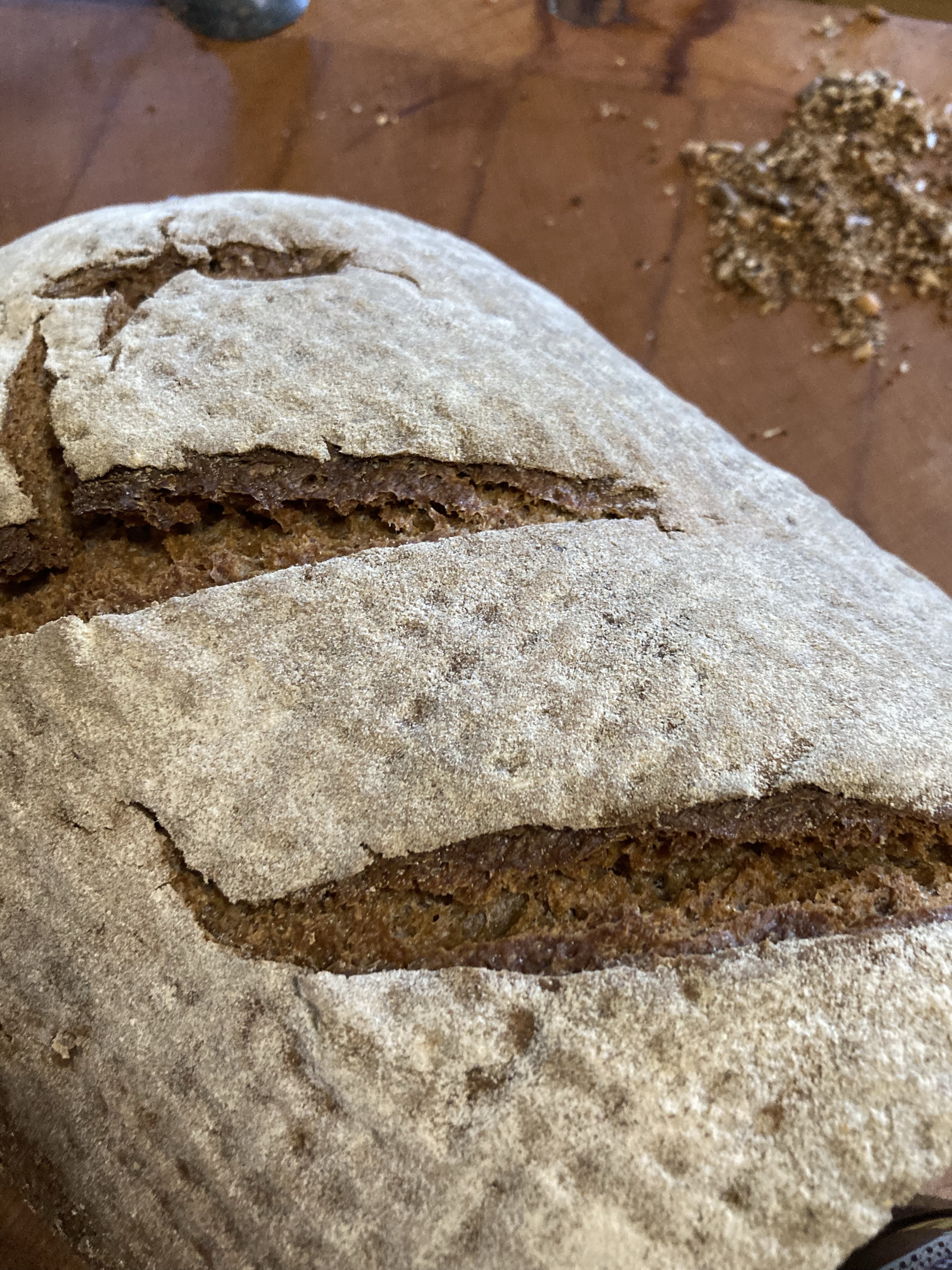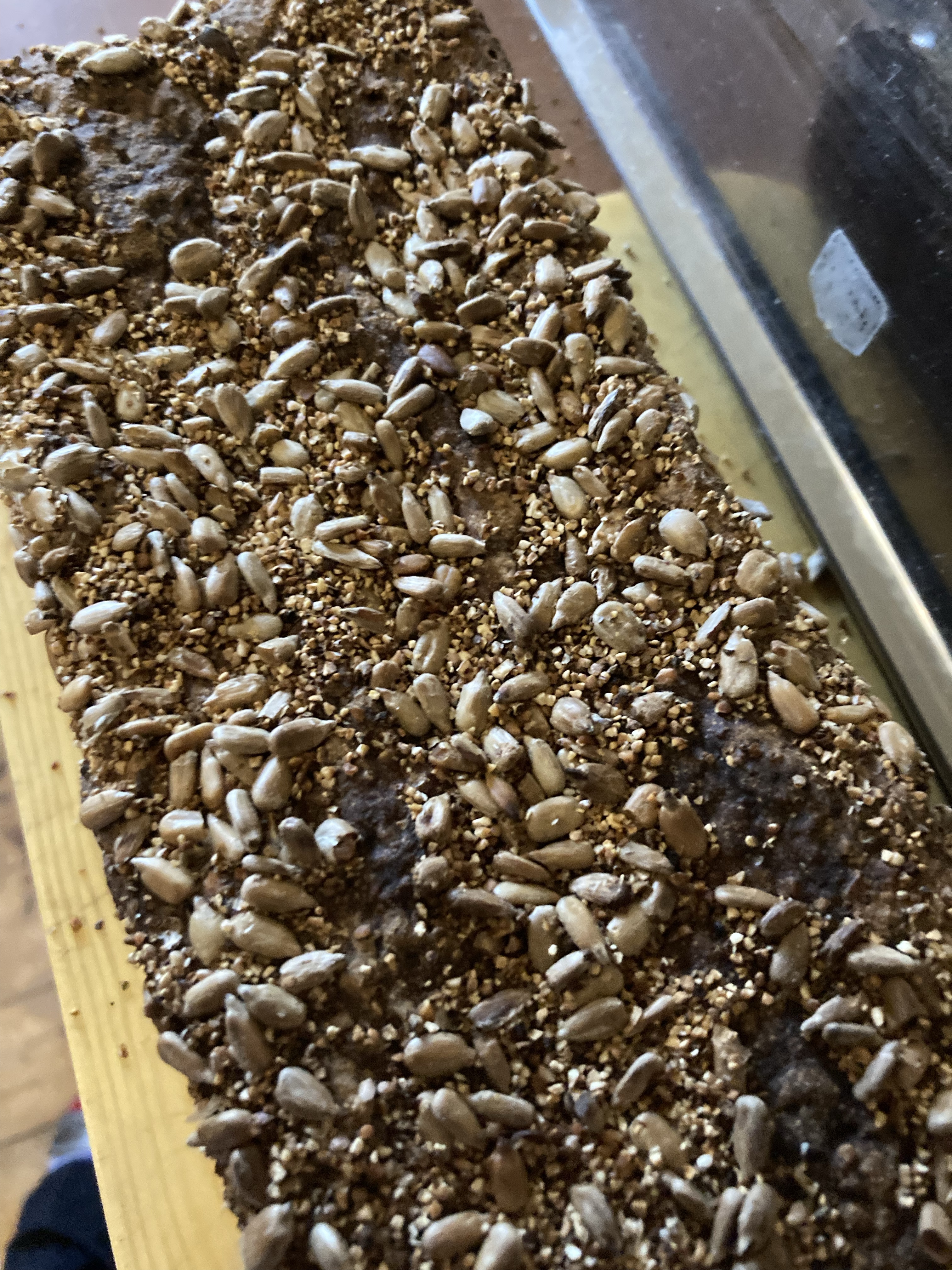 [folienstern:] „Soooo – ein Graubrot, ein Schwarzbrot und Nusspotize. Der Teig war bisschen komisch, aber lecker ist es. Reicht wieder für Schulbrot jetzt.“