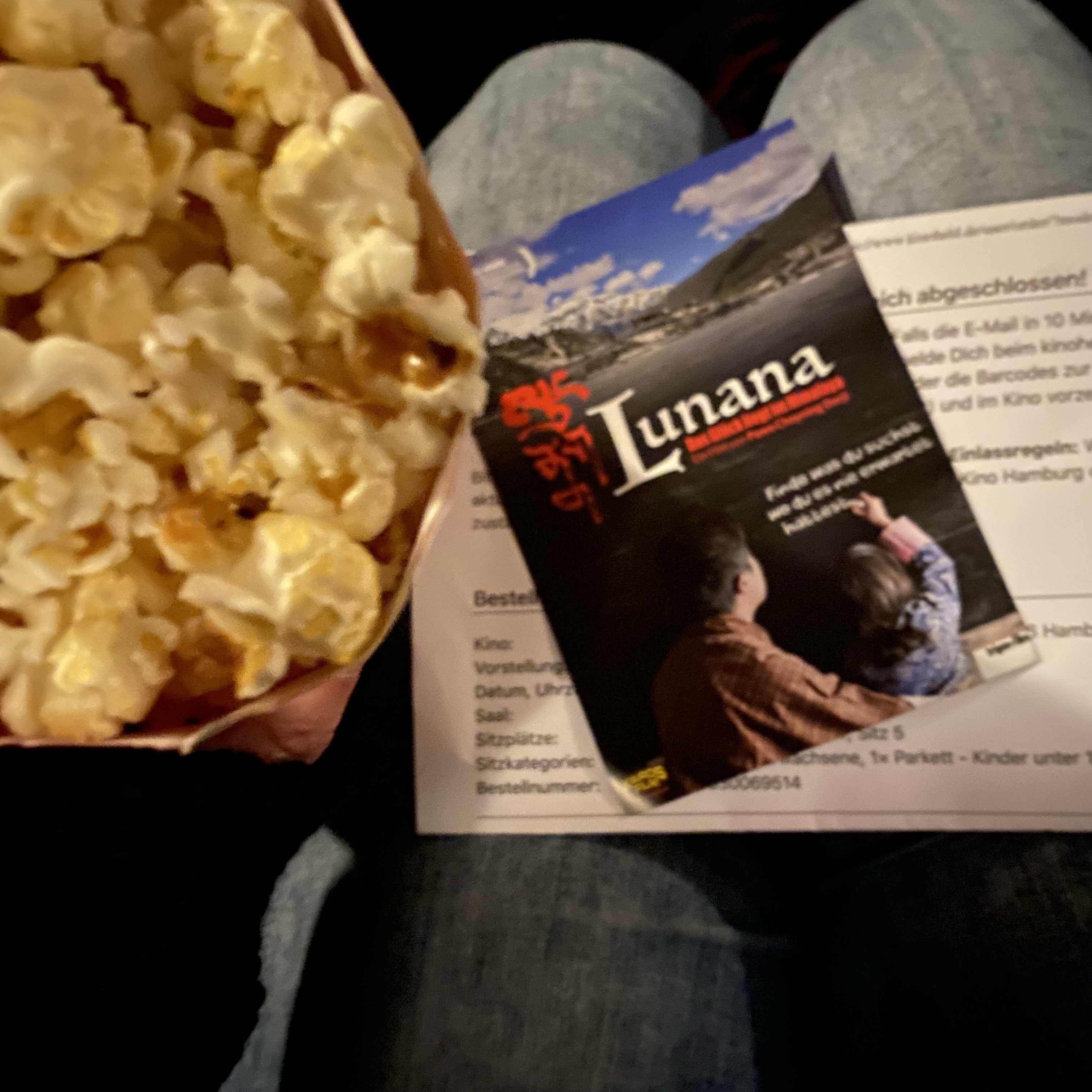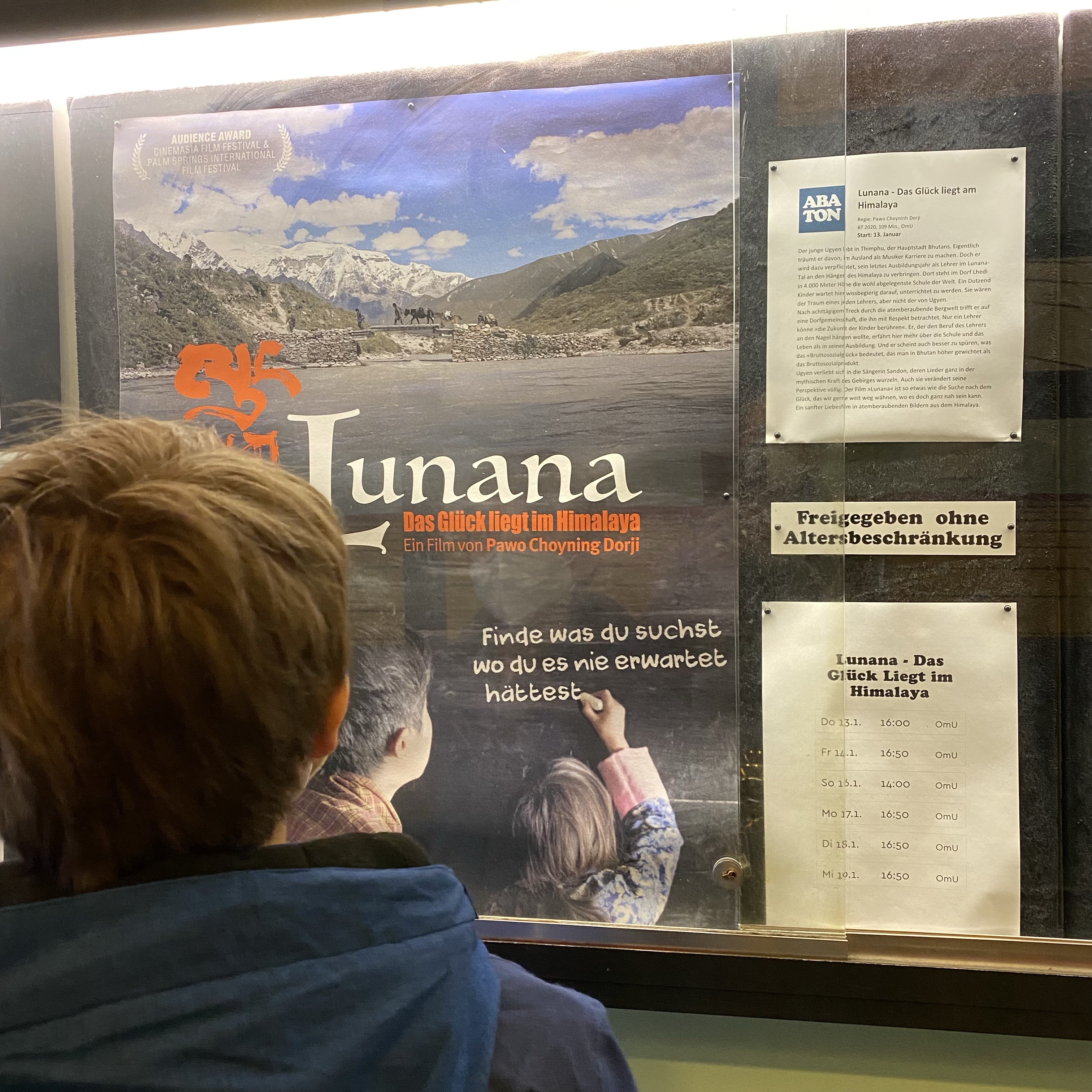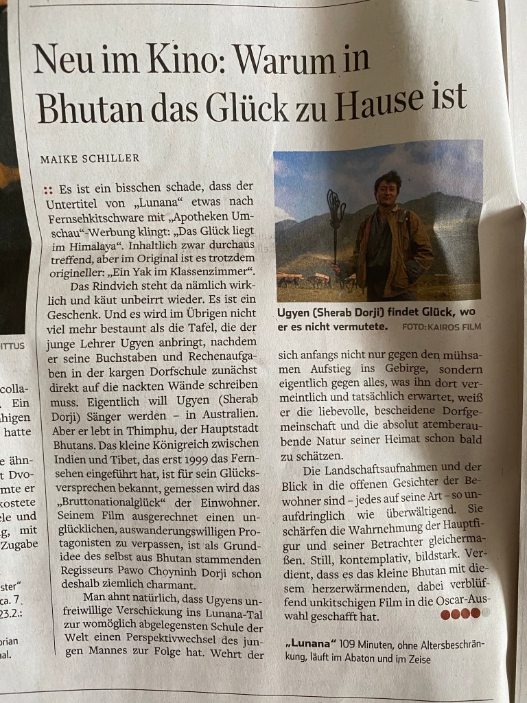 [kneteeis:] „Ach, guck‘ mal: In der Zeitung steht, dass diese Woche ‚Lunana‘ im Abaton läuft! Wollen wir da hin gehen? Das ist der Film, den unser Freund aus Bhutan gedreht hat. Der ist jetzt sogar für einen Oscar nominiert.“