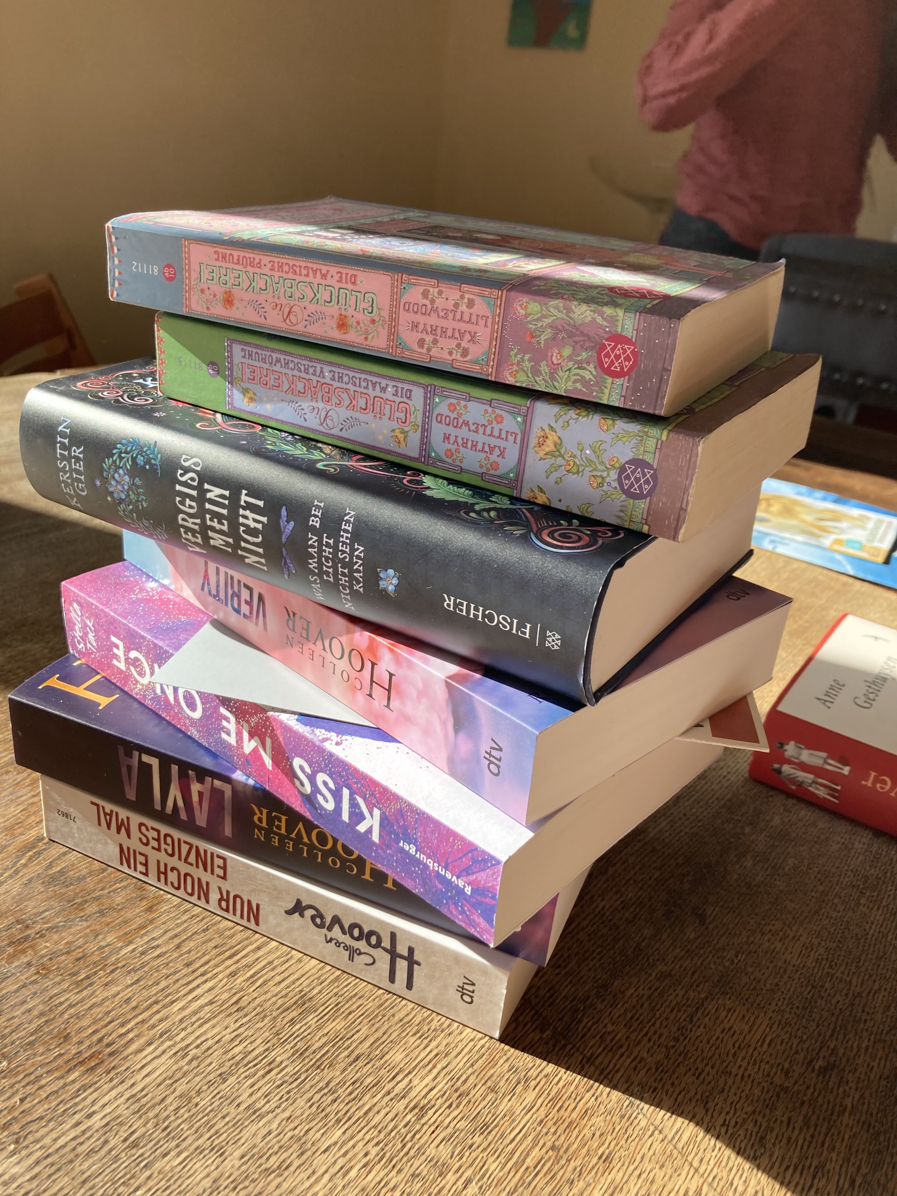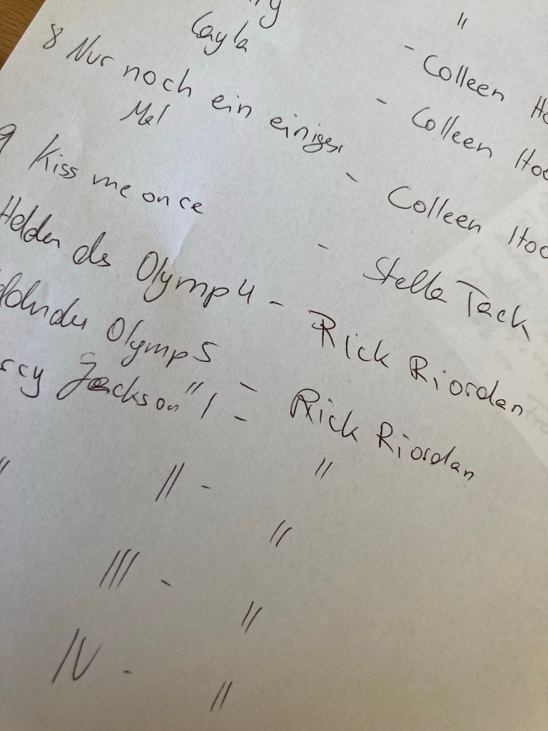 [GM:] „Okay – ich mach mal eine Liste: Die Colleen-Hoover-Bücher. Percy Jackson. Magnus Chase. Warrior Cats. Glücksbäckerei … Ich komme auf 24. Das sind bis Ostern – 2,6 Bücher die Woche. Das schaffe ich locker!“