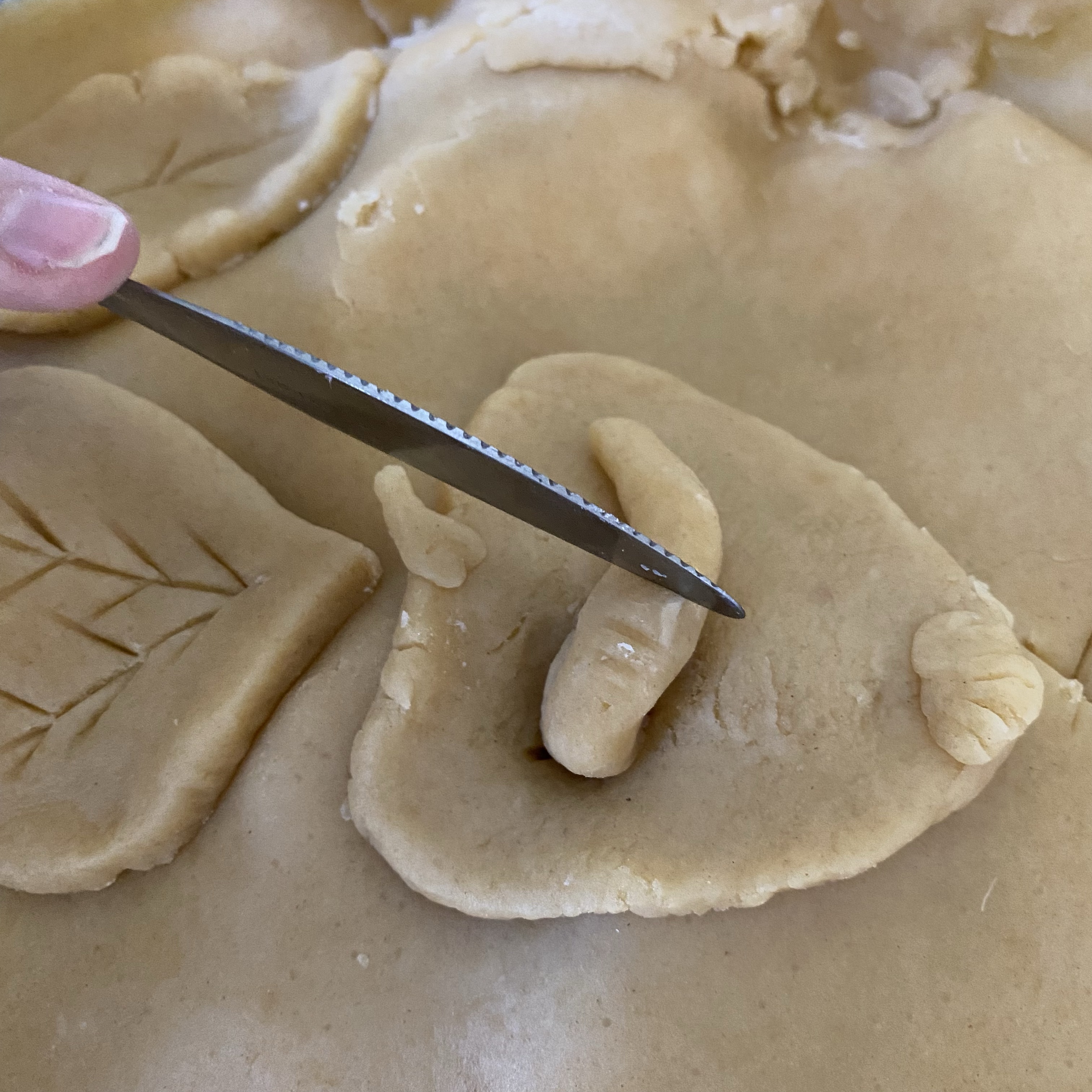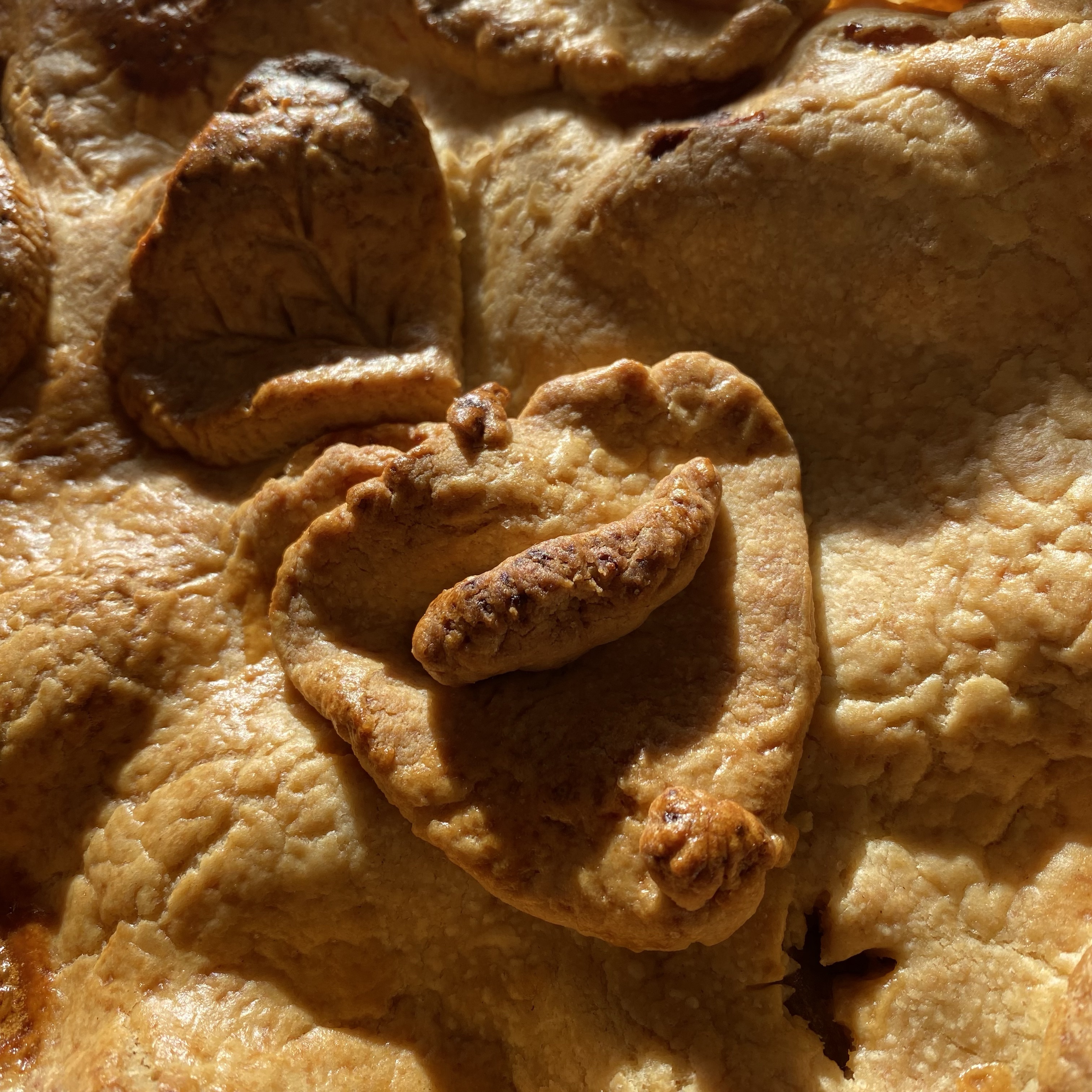 [Etwas später. GJ:] „Guck‘ mal! Aus dem Teigrest mache ich noch einen Wurm, der aus dem Apfel kriecht!“