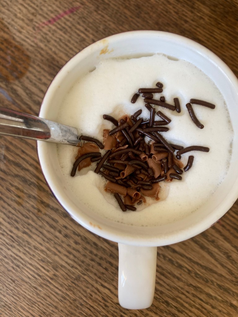 [folienstern:] „Okay. Ooh, das sieht aber hübsch aus jetzt, Dein Kakao!“