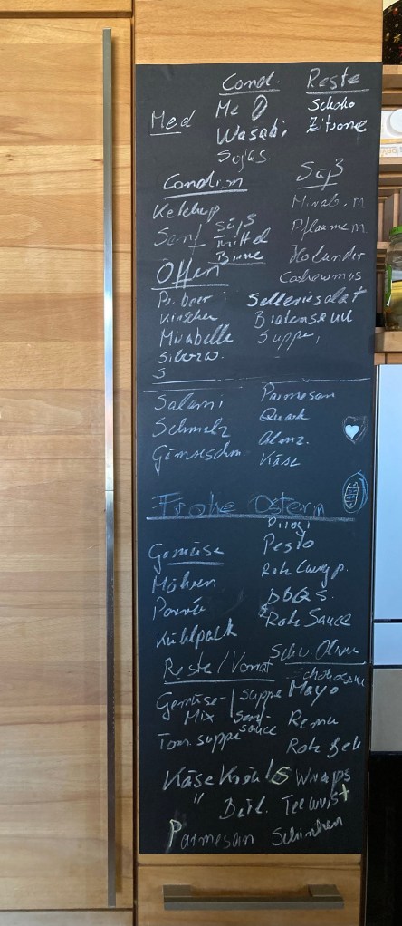 [folienstern:] „So – Kühlschrank aufgeräumt. Jetzt mache ich noch die Tafelfolie an die Schranktür und wir gucken mal, ob wir damit vielleicht länger den Überblick behalten.“
