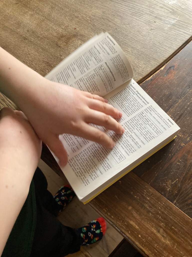 [KM:] „Also, Mama, ich brauche fünf Würfel. Und ein Wörterbuch. Ich mache Passwörter.“