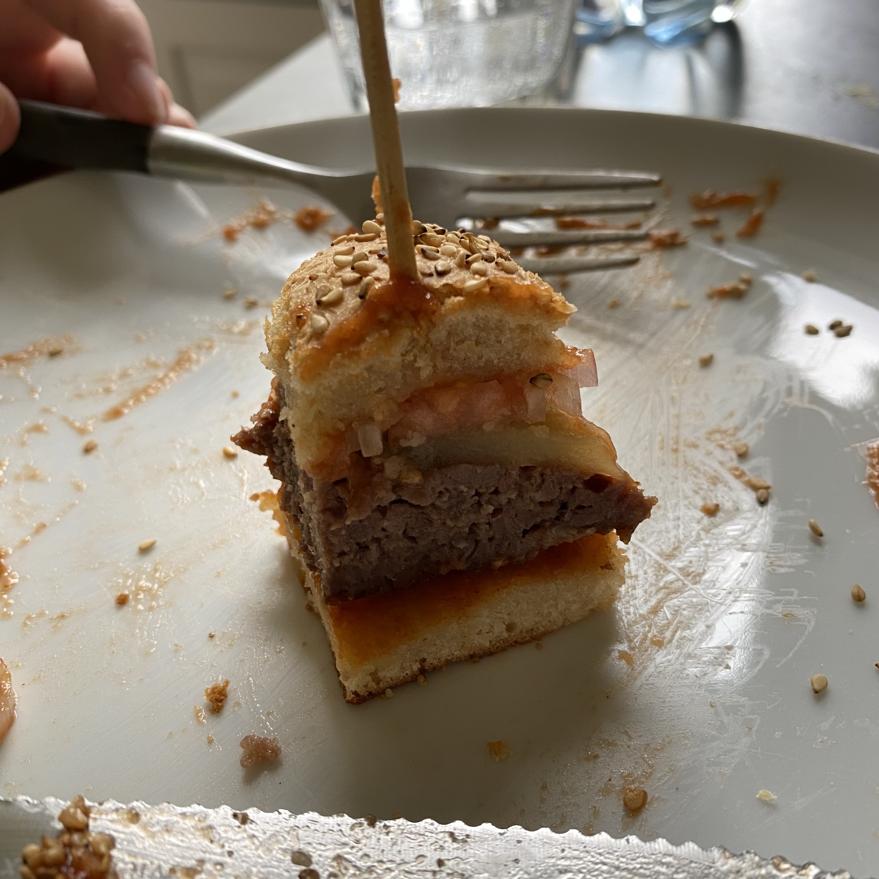 [Etwas später. GJ:] „Hm, das ist lecker! Aber jetzt bin ich satt. Ich glaube, ich muss den letzten Viertelburger übrig lassen…“