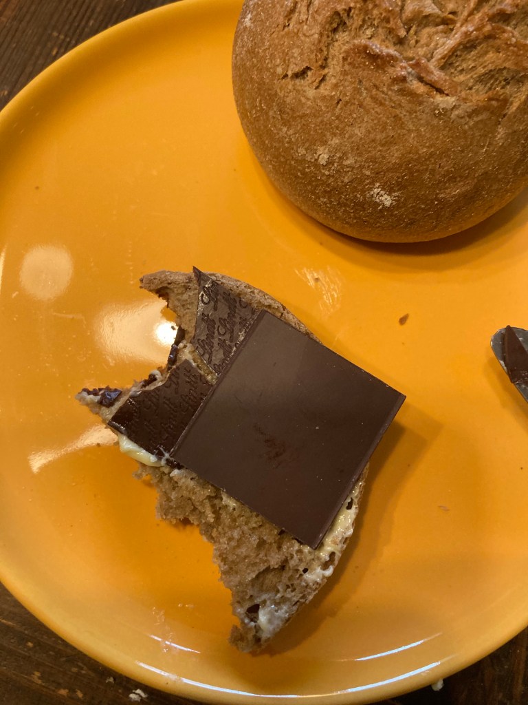 [folienstern:] „Ha, weißt Du was? Ich habe noch dünne Schokolade, und weil heute Sonntag ist, faste ich nicht. Willst Du was abhaben?“