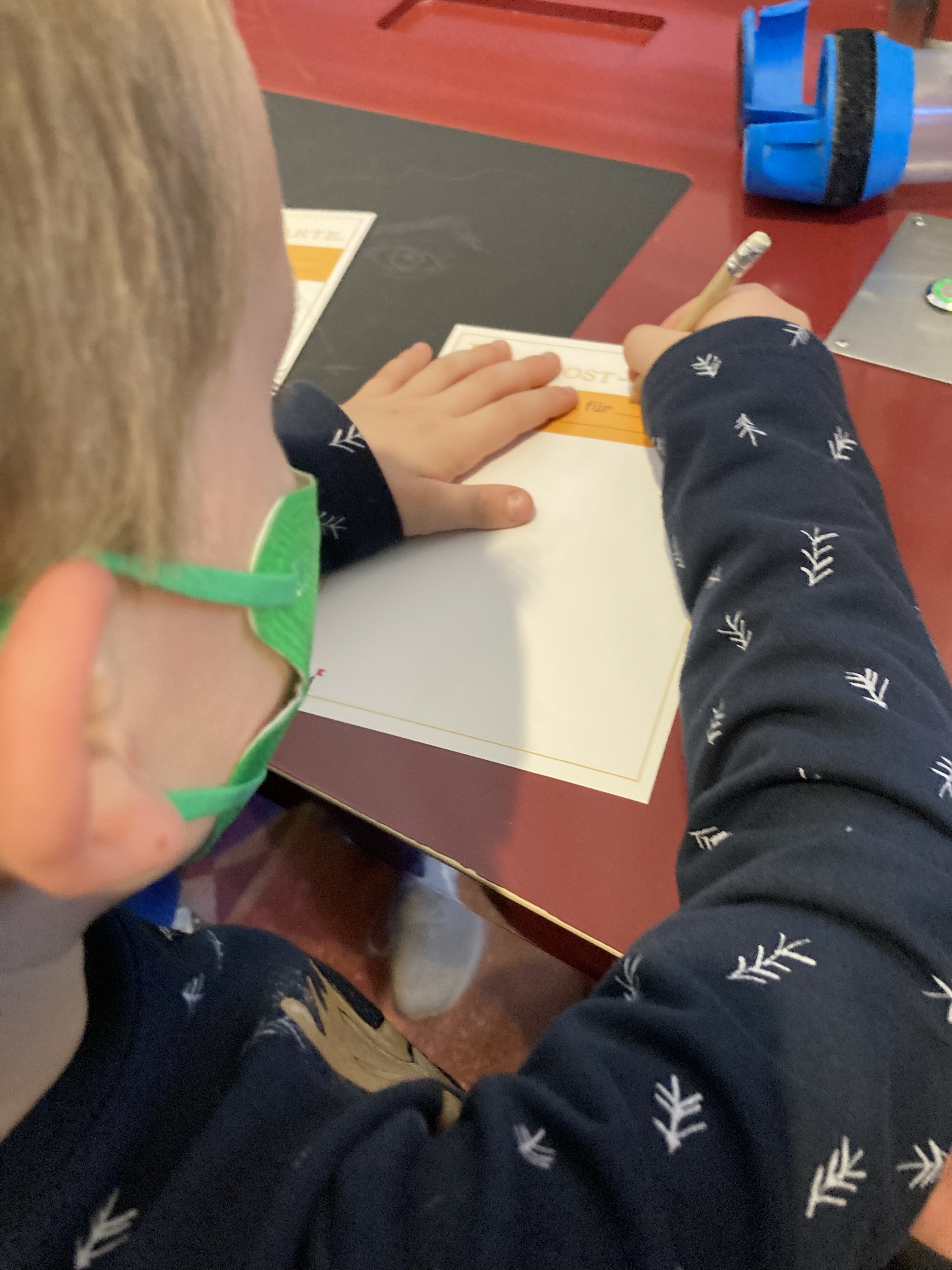 [KJ:] „Ich schreibe auf dasselbe Blatt nochmal! Los, Mama, Du bist die Empfängerin!“