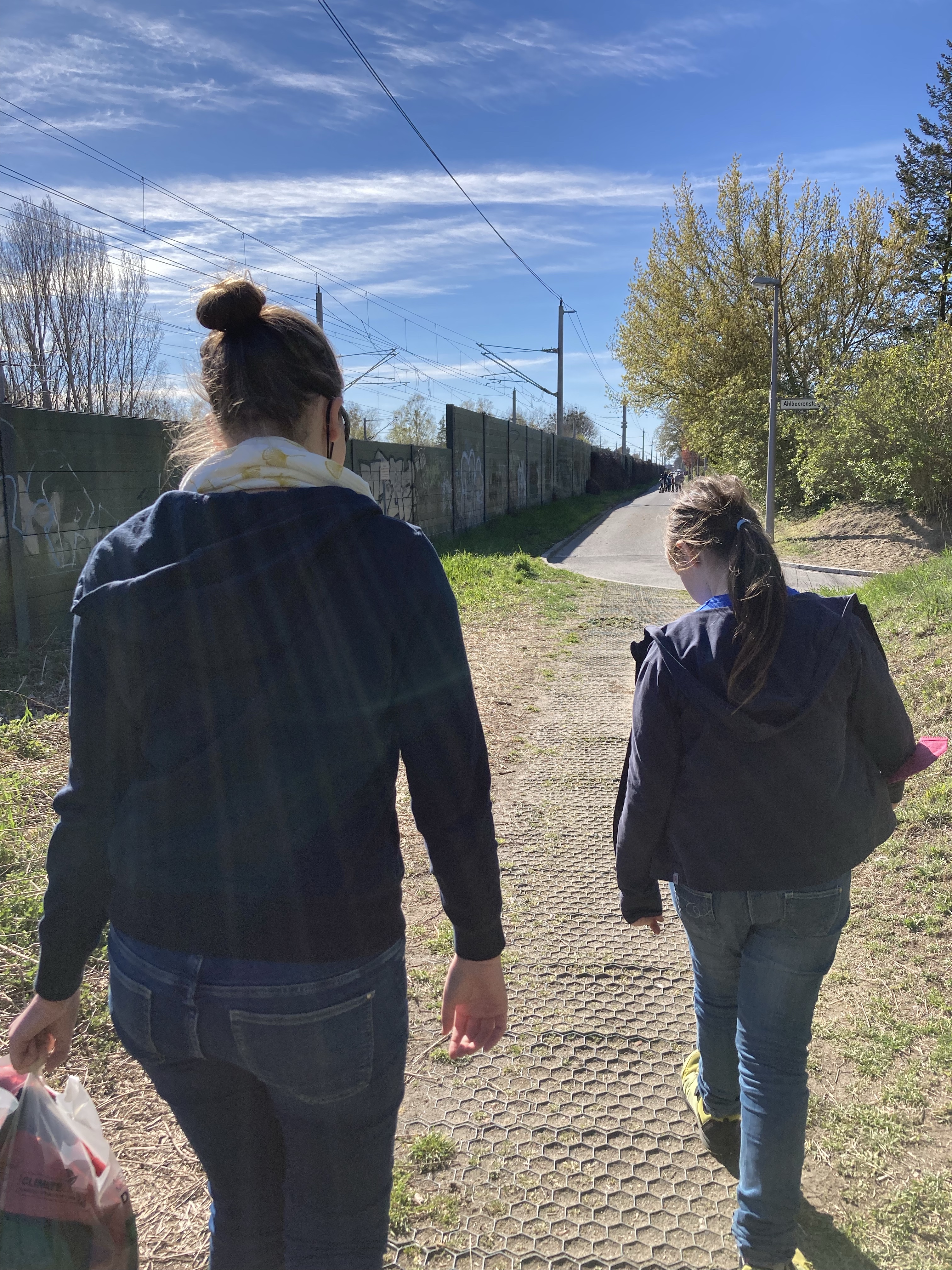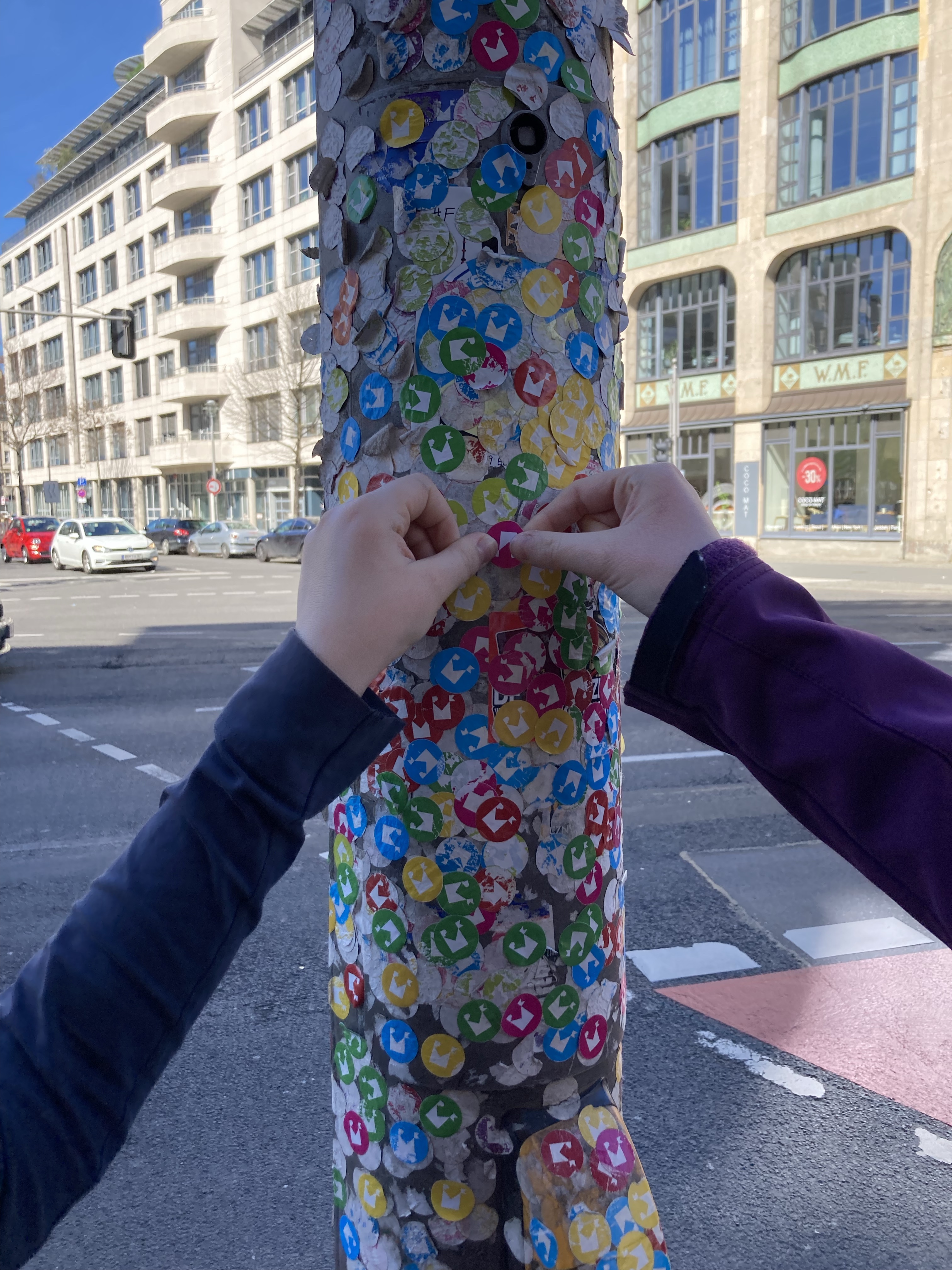 [Etwas später. KM, GM:] „Guck mal, da sind lauter Aufkleber vom Museum an dem Pfosten.“