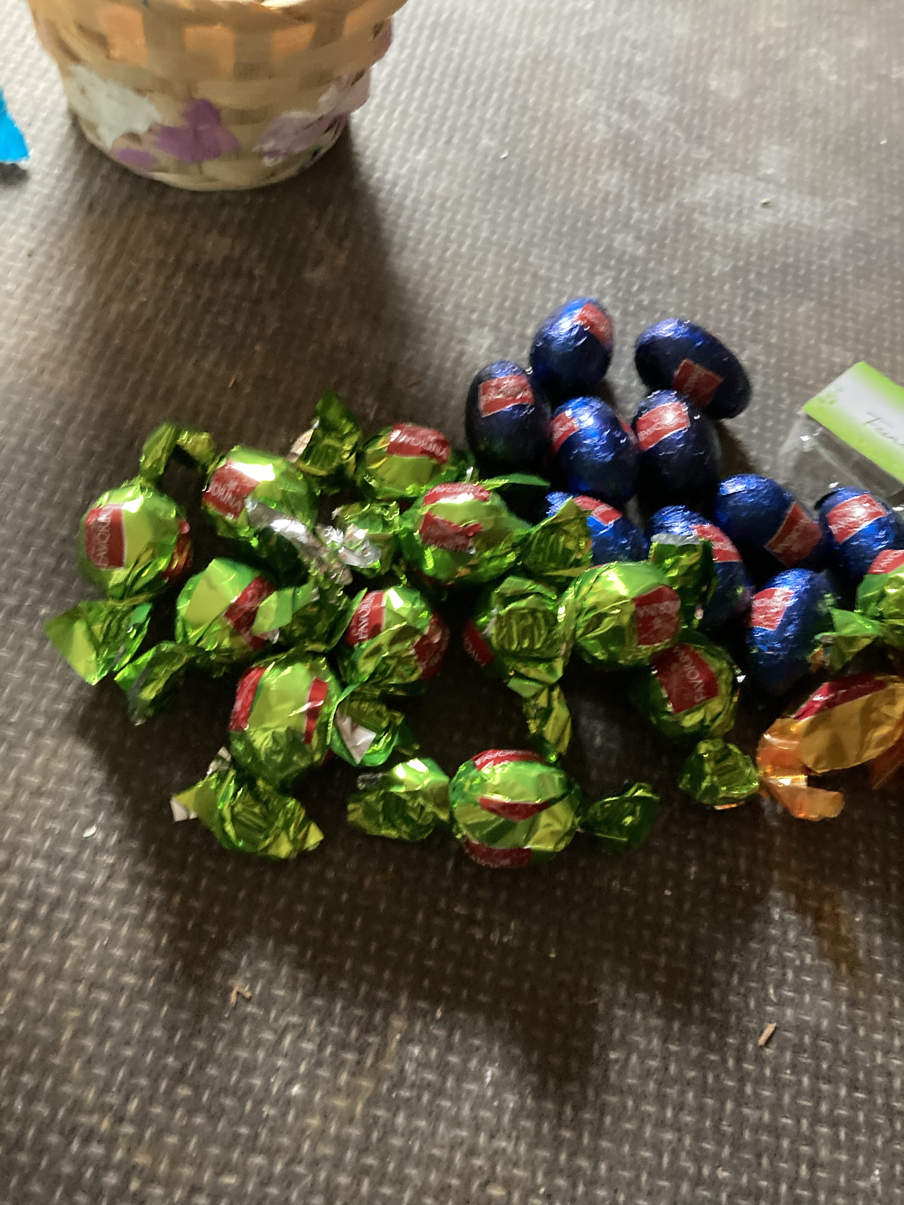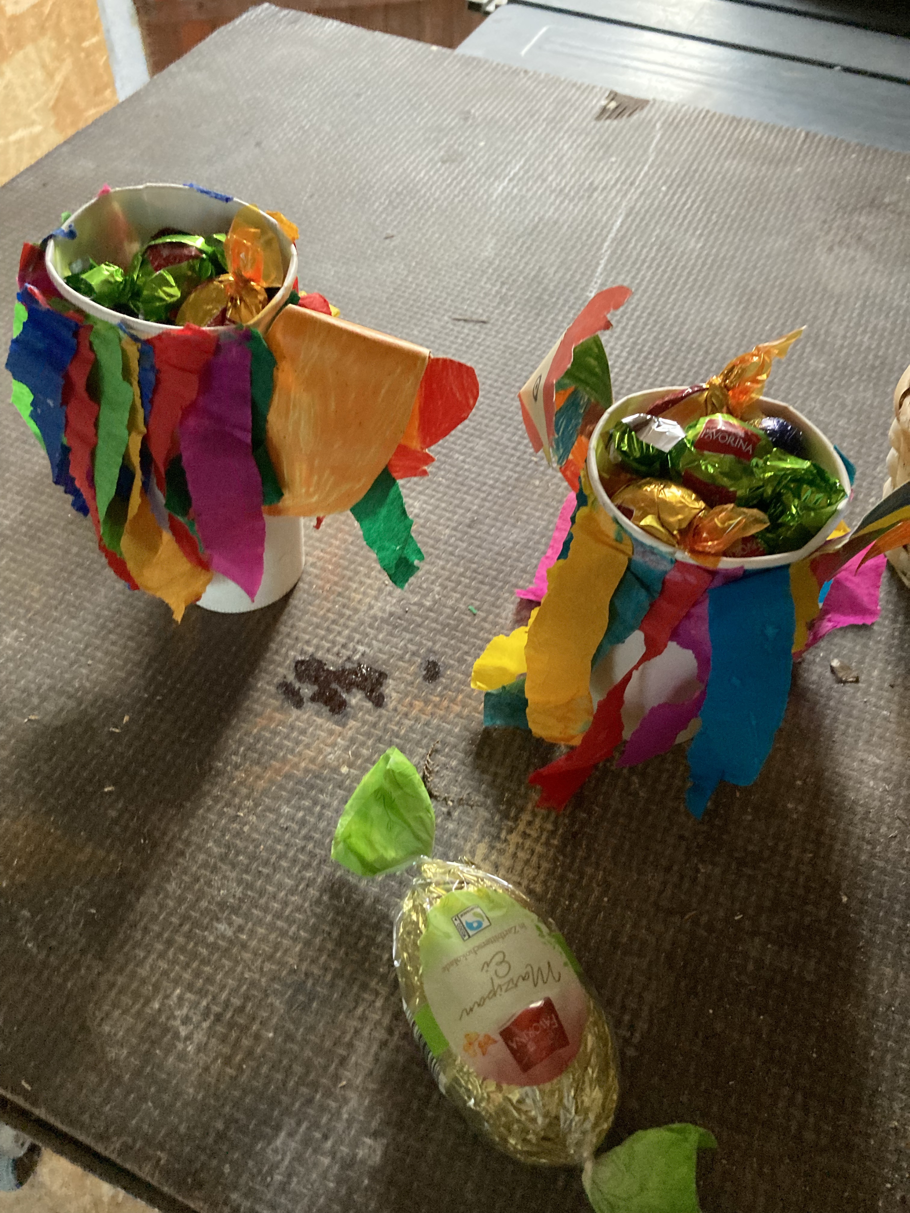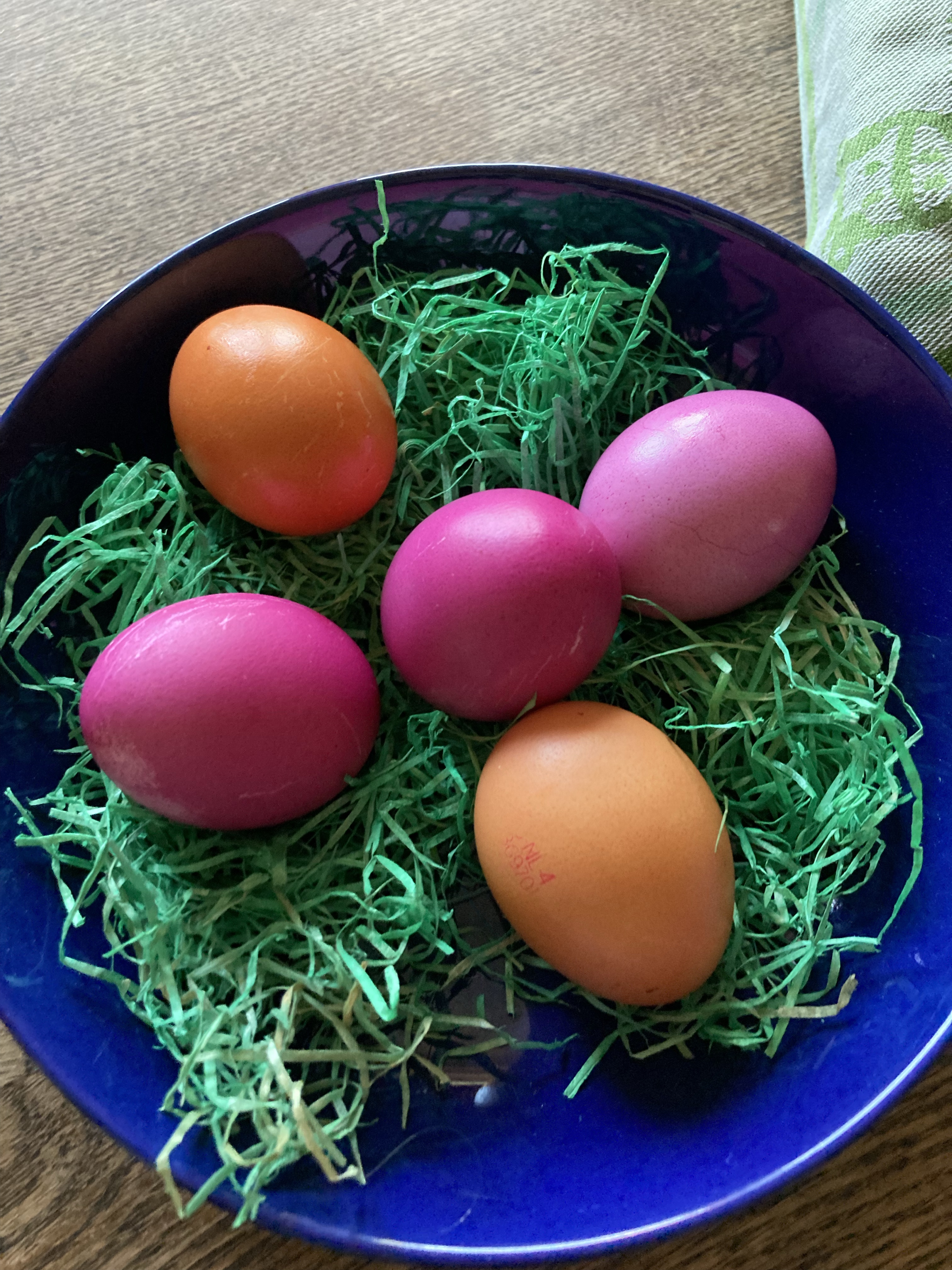 [Etwas später. GJ:] „Guck‘ mal, Mami: Ich habe Dir Osterbesucher mitgebracht. Wenn wir die Eier schon nicht färben können, dann können ja wenigstens die Besucher bunt sein!“