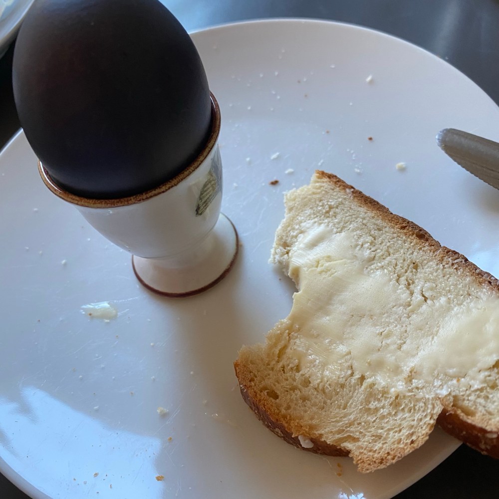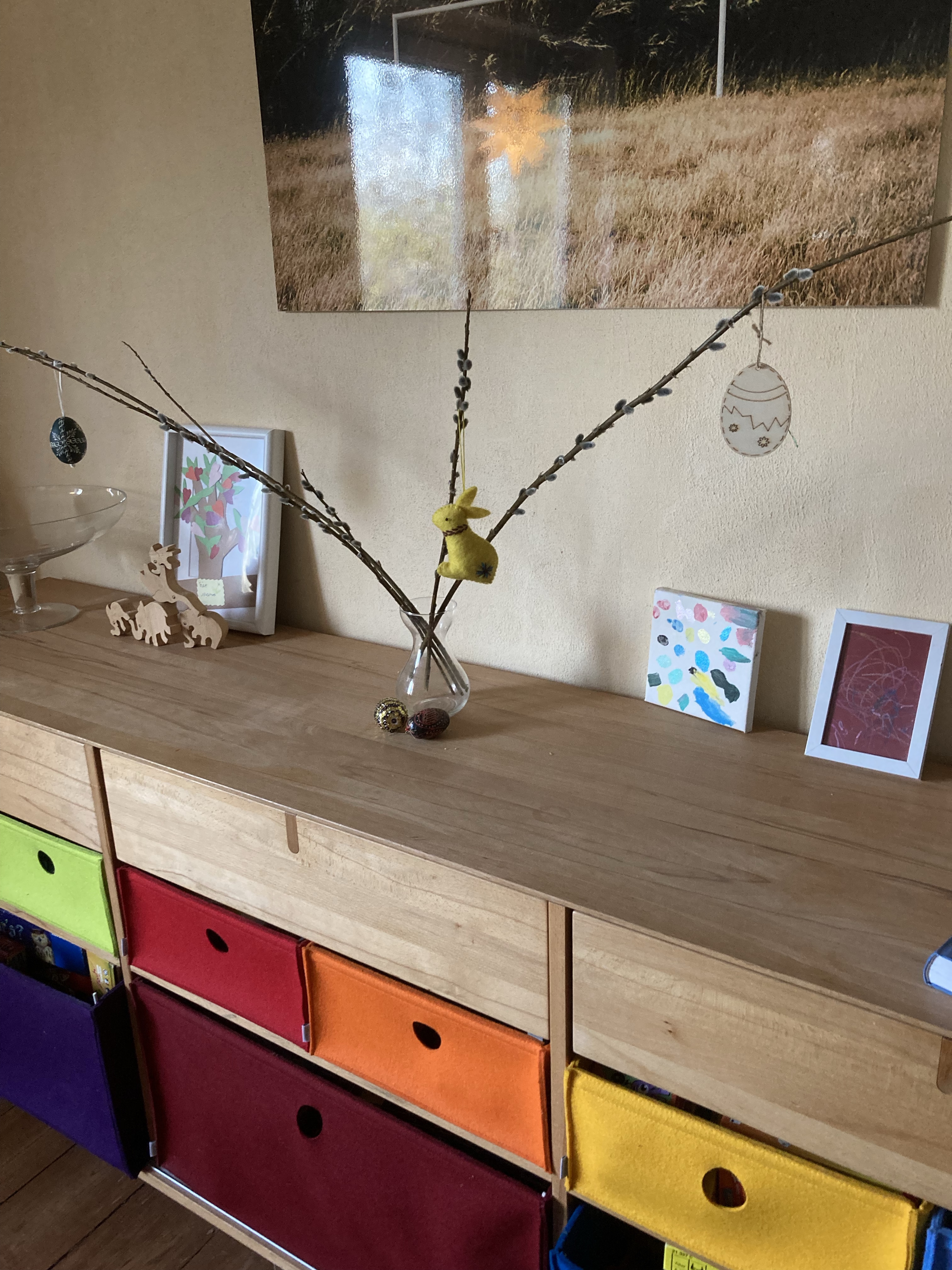 [Etwas später. kneteeis:] „Ha! Die Farben sind aufgetaucht! In einem Schrank, wo sie gar nicht hingehören! Jetzt gibt es Osterfrühstück mit Eiern und Osterzopf, weil Du ja morgen nicht da bist!“
