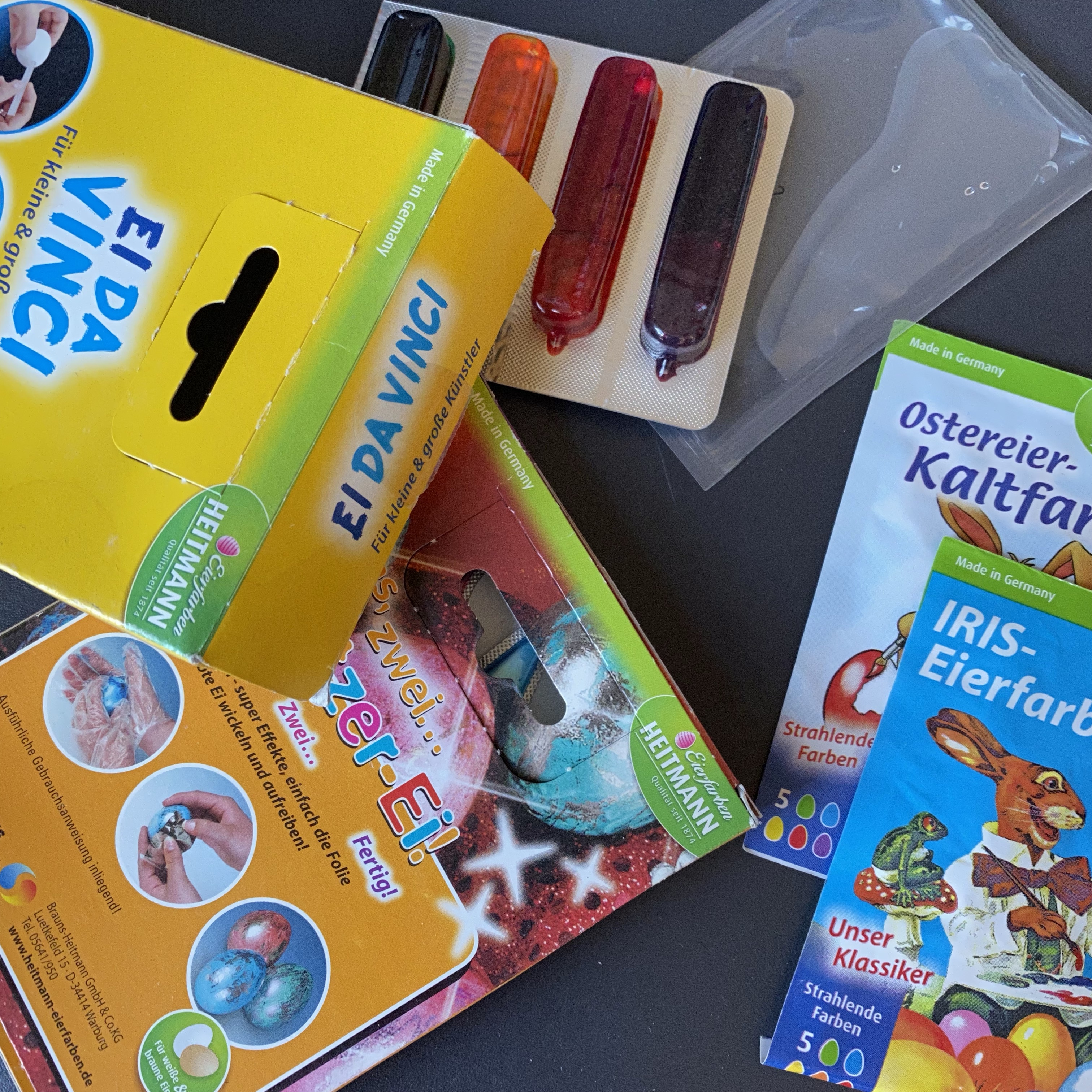 [kneteeis:] „Ich glaube, ich mache noch blaue Ostereierfarbe fertig. Das Gelb sieht man bei den braunen Eiern nicht so gut…“