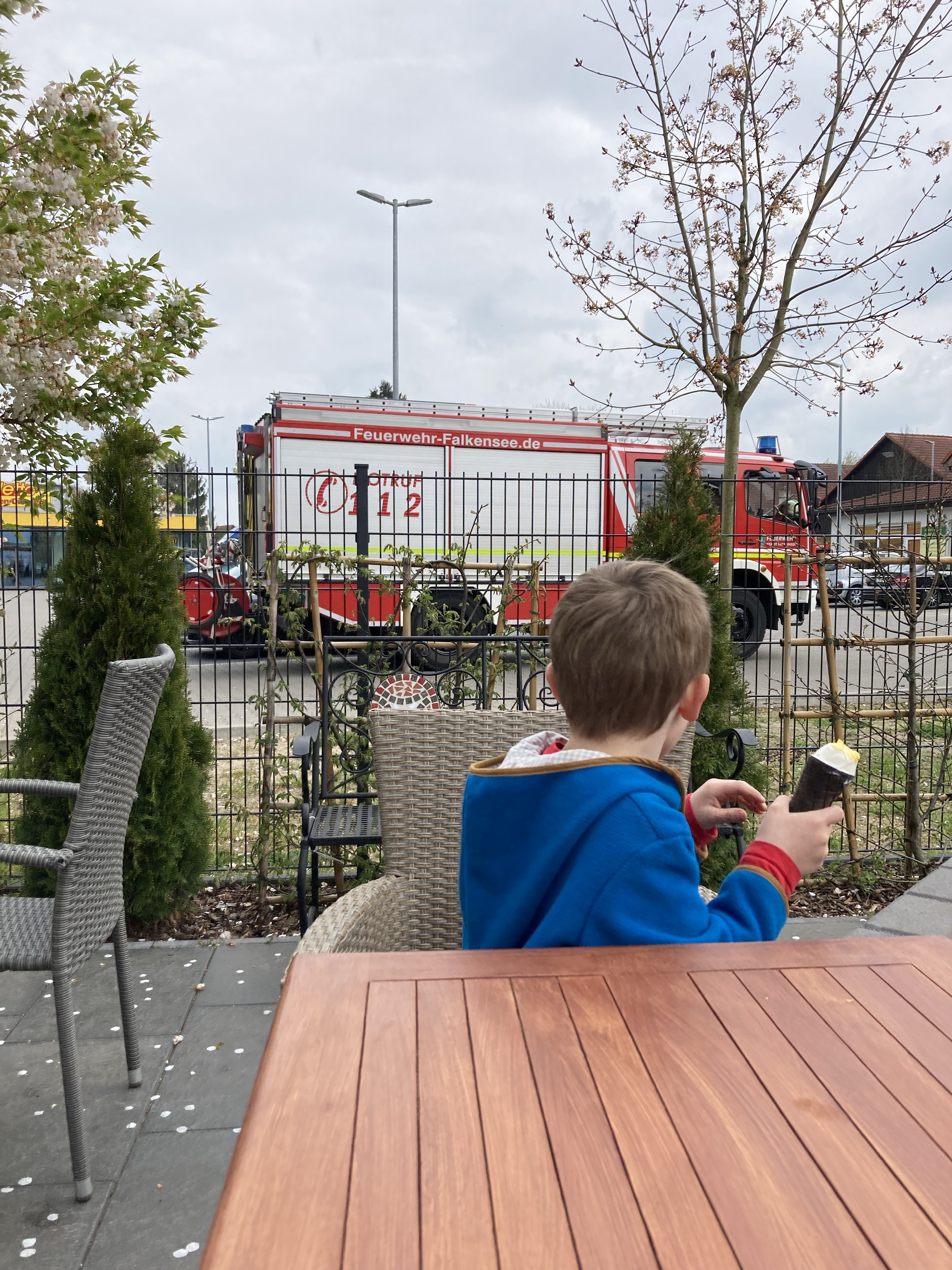 [Etwas später. KJ:] „Boah – ein Löschgruppenfahrzeug! Und ein Drehleiterfahrzeug! Guck mal – die Feuerwehrmänner kaufen sich auch Eis!“