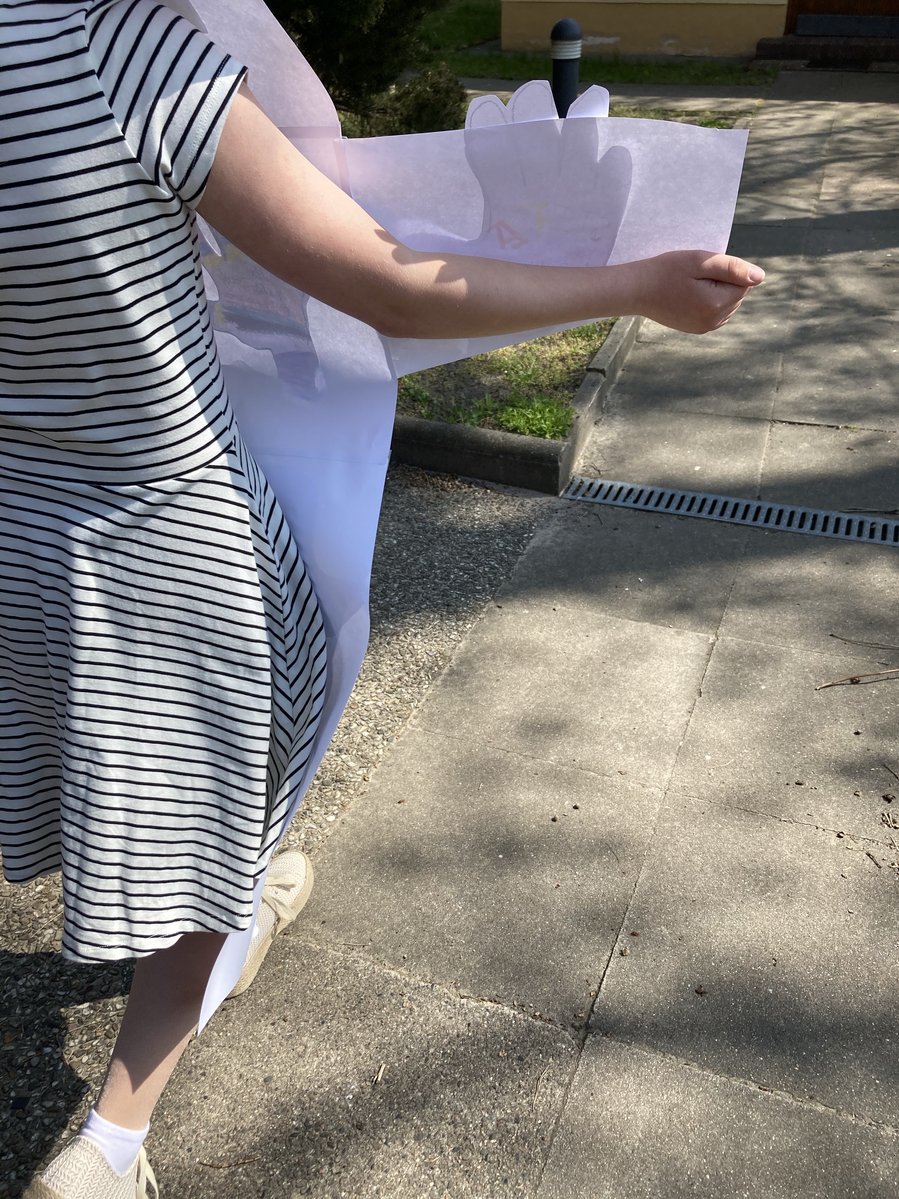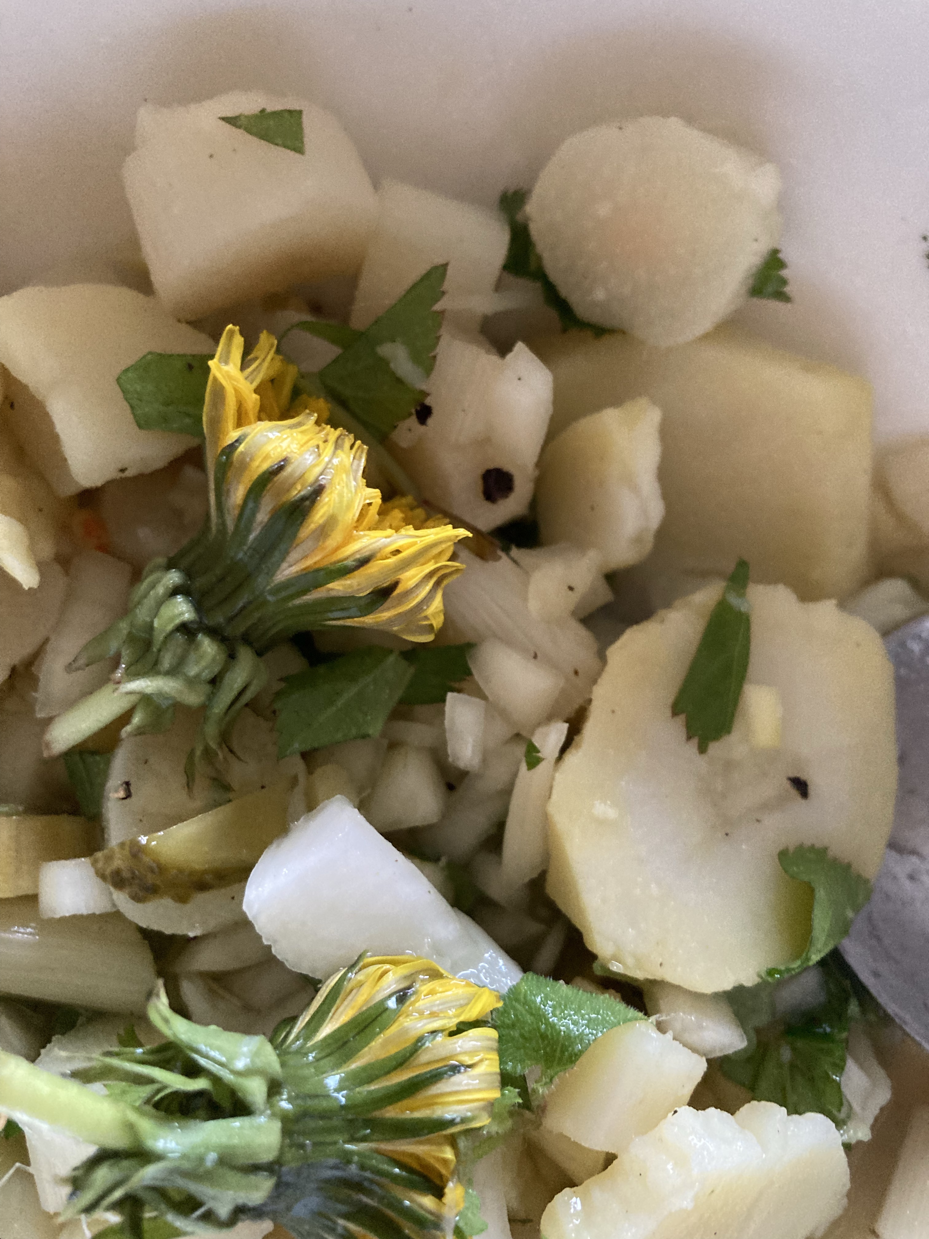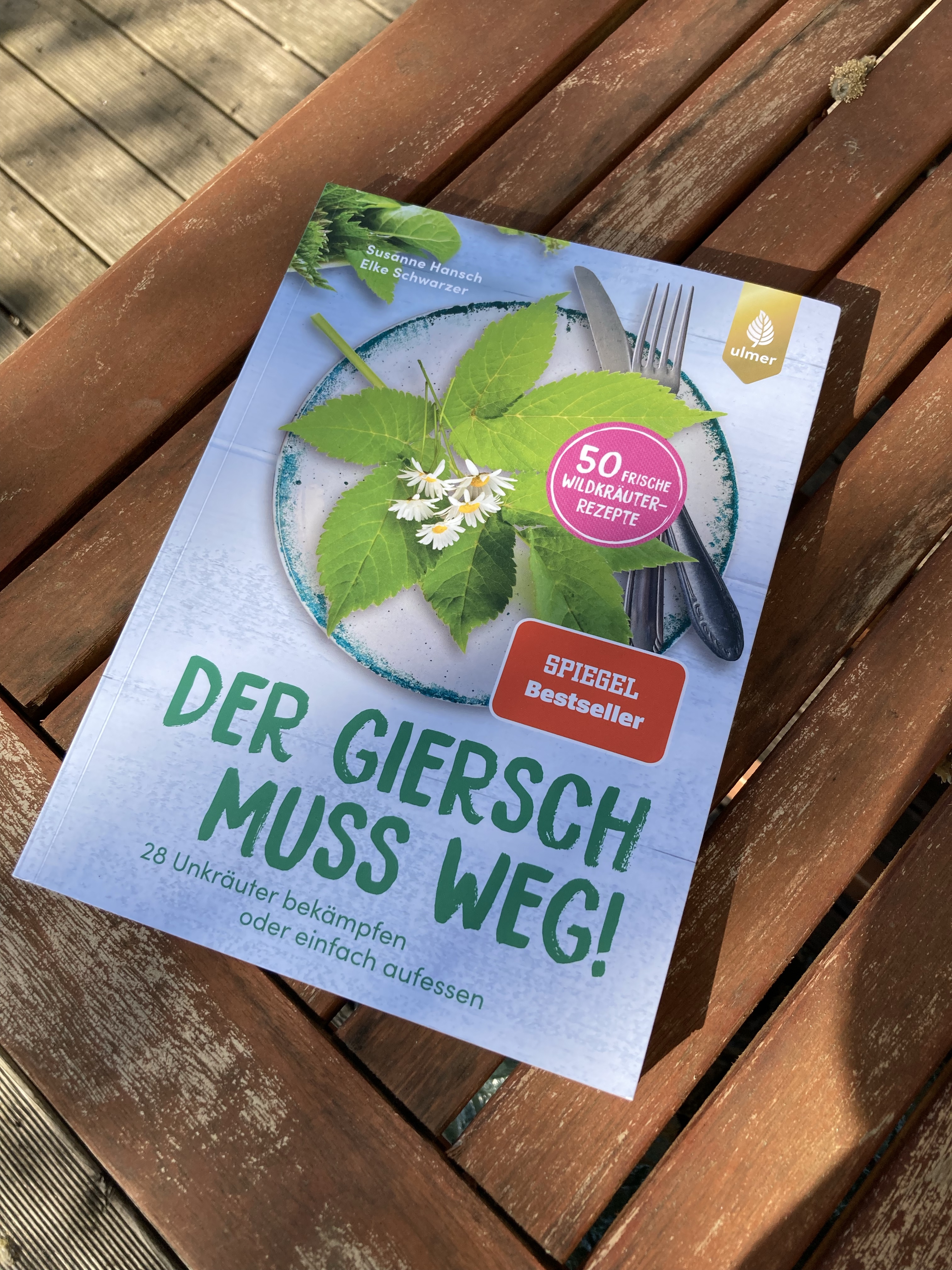 [Etwas später. folienstern:] „Ich probiere jetzt mal zum Grillen aus, wie das Giersch-Rezept aus dem Buch schmeckt, das Papa für mich gefunden hat! Kartoffelsalat mit Giersch. Das Butterbrot mit Gänseblümchen gestern war schon lecker.“