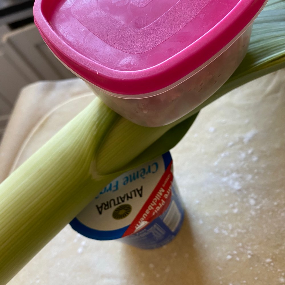 [kneteeis:] „Ich glaube, so können wir das nicht in den Ofen stellen. Machst Du den mit Crème fraîche und Lauch fertig? Dann bereite ich den anderen vor.“