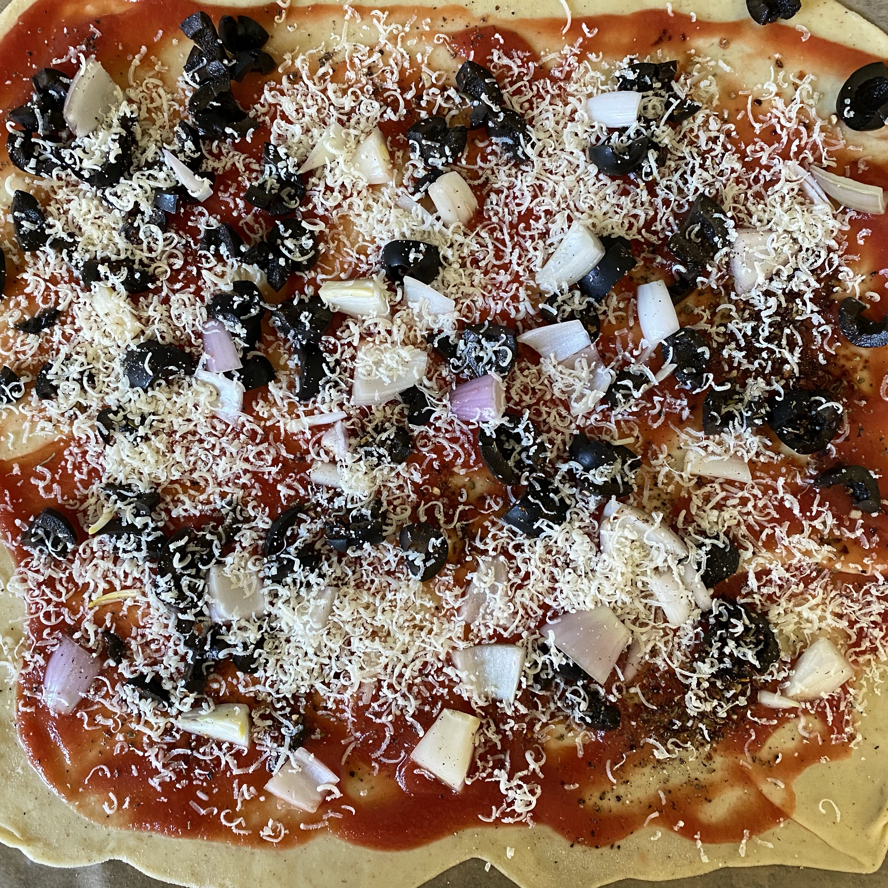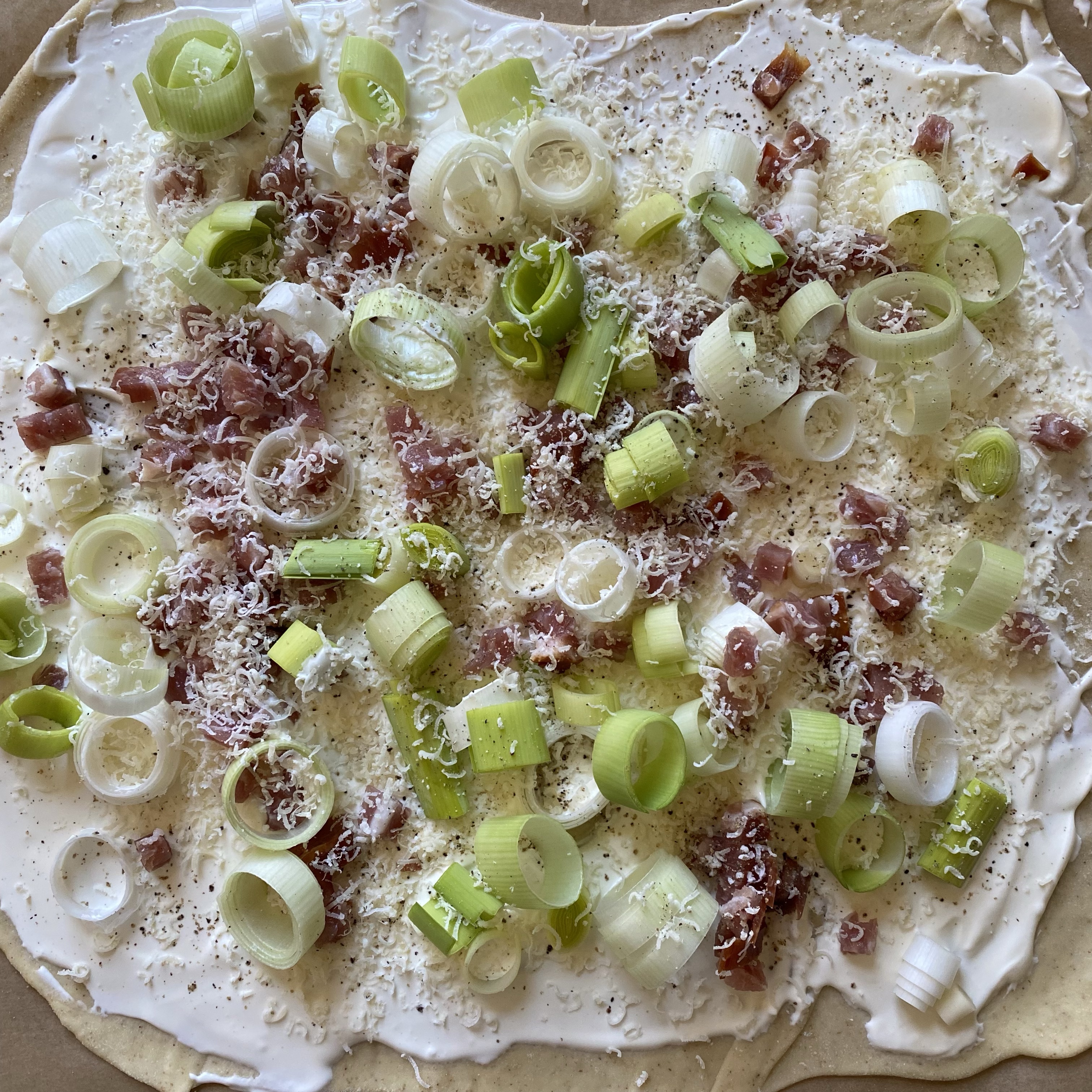 [kneteeis:] „Ja. Aber wir haben nur Crème fraîche für ein Blech. Machen wir das andere mit Tomate und Oliven?“