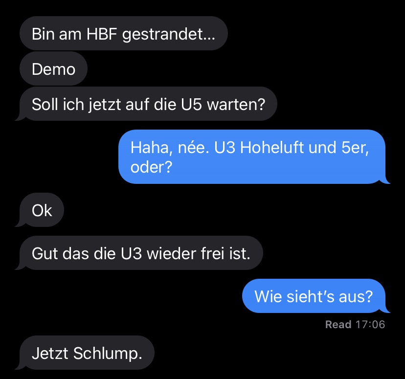 [GJ an kneteeis, per Messenger:] „Bin am Hauptbahnhof gestrandet… Demo. Soll ich jetzt auf die U5 warten?“
