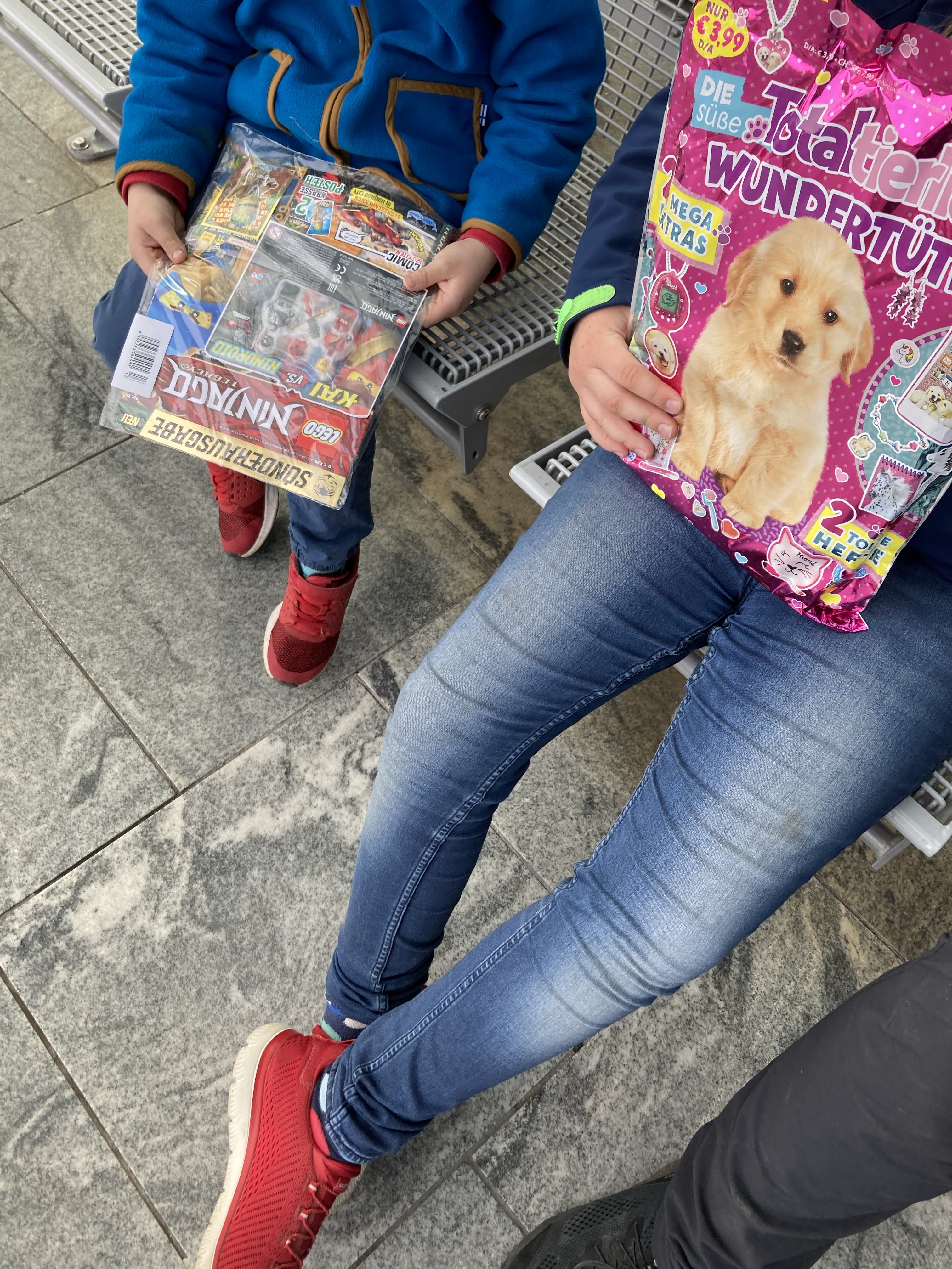 [Vater:] „Ich nehme mal die Koffer, dann könnt Ihr noch in den Zeitschriftenladen.“