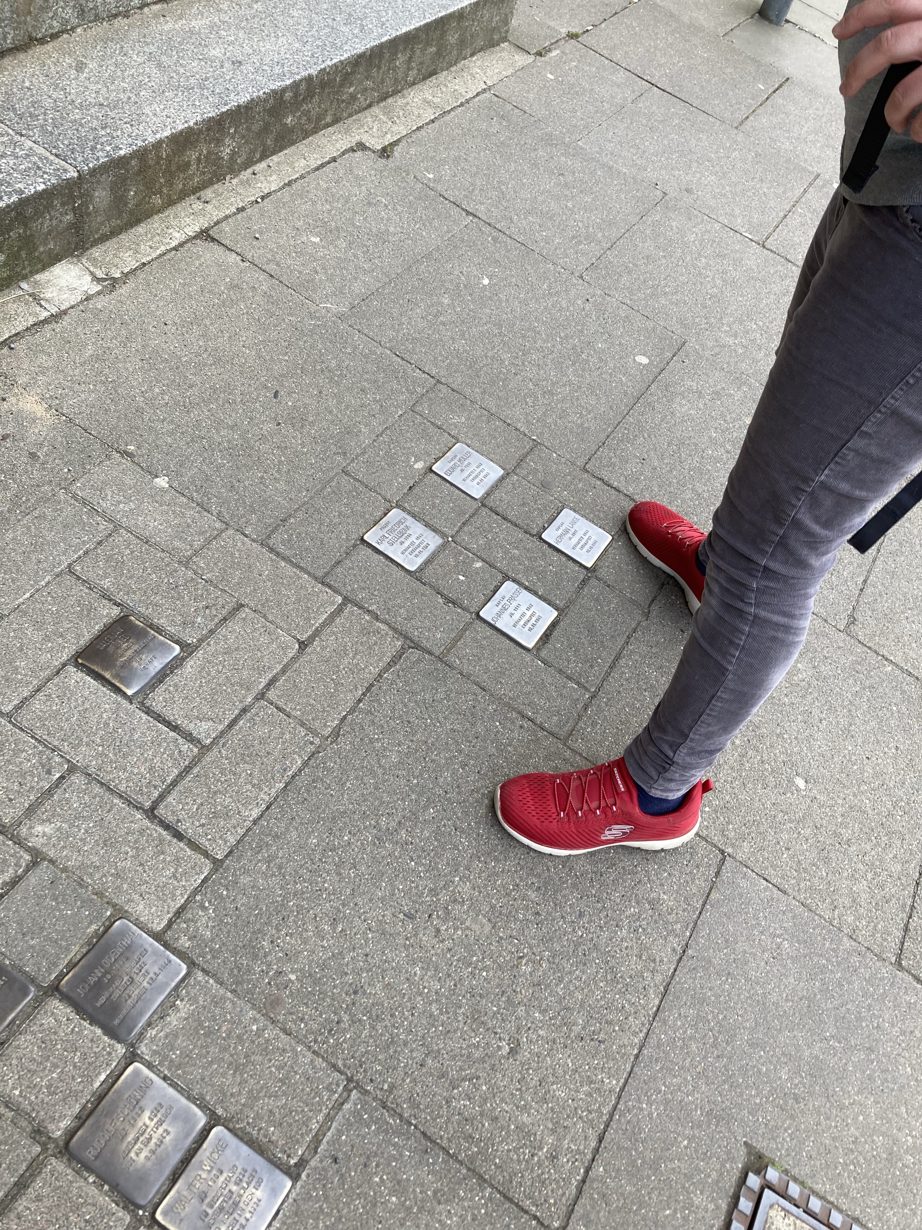 [Etwas später. KM:] „Oh, da sind ganz viele Stolpersteine! Warte mal kurz. Was ist das hier? Und was heißt enthauptet?“