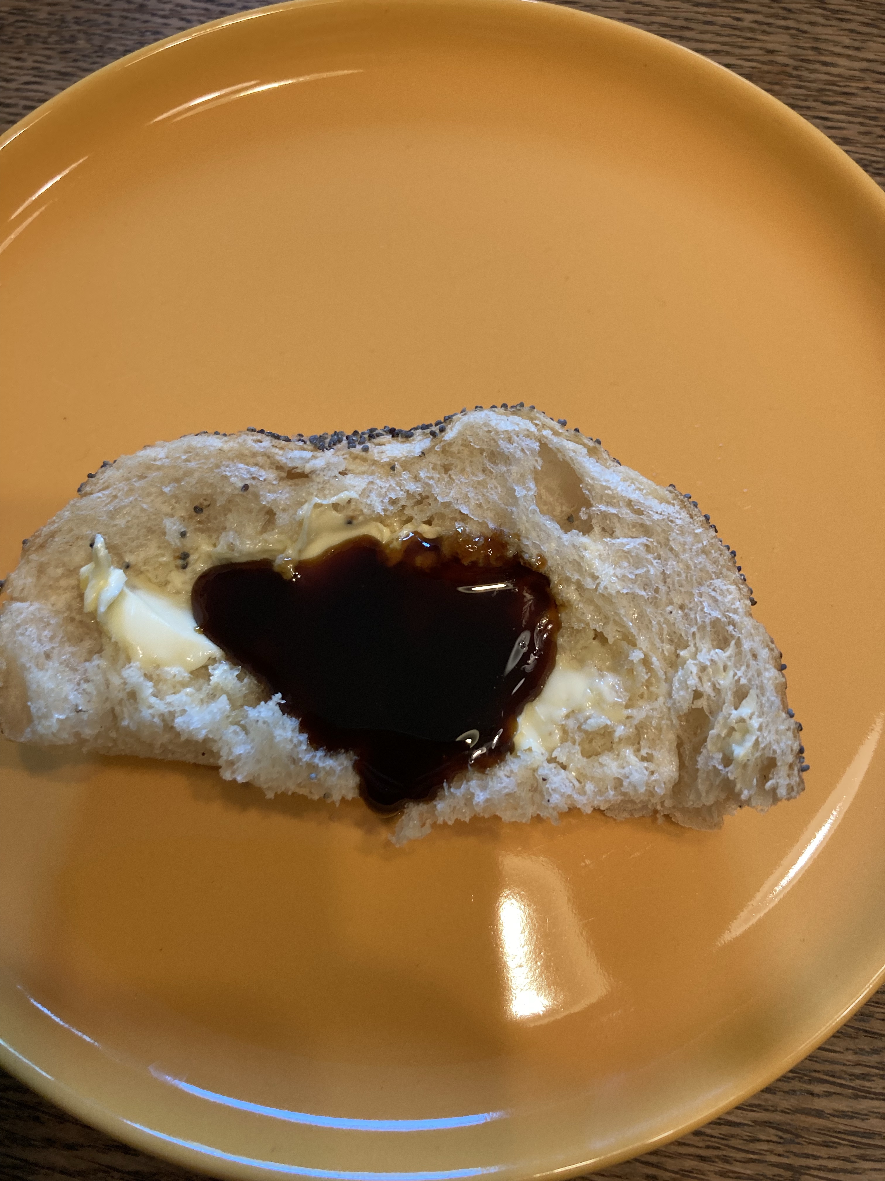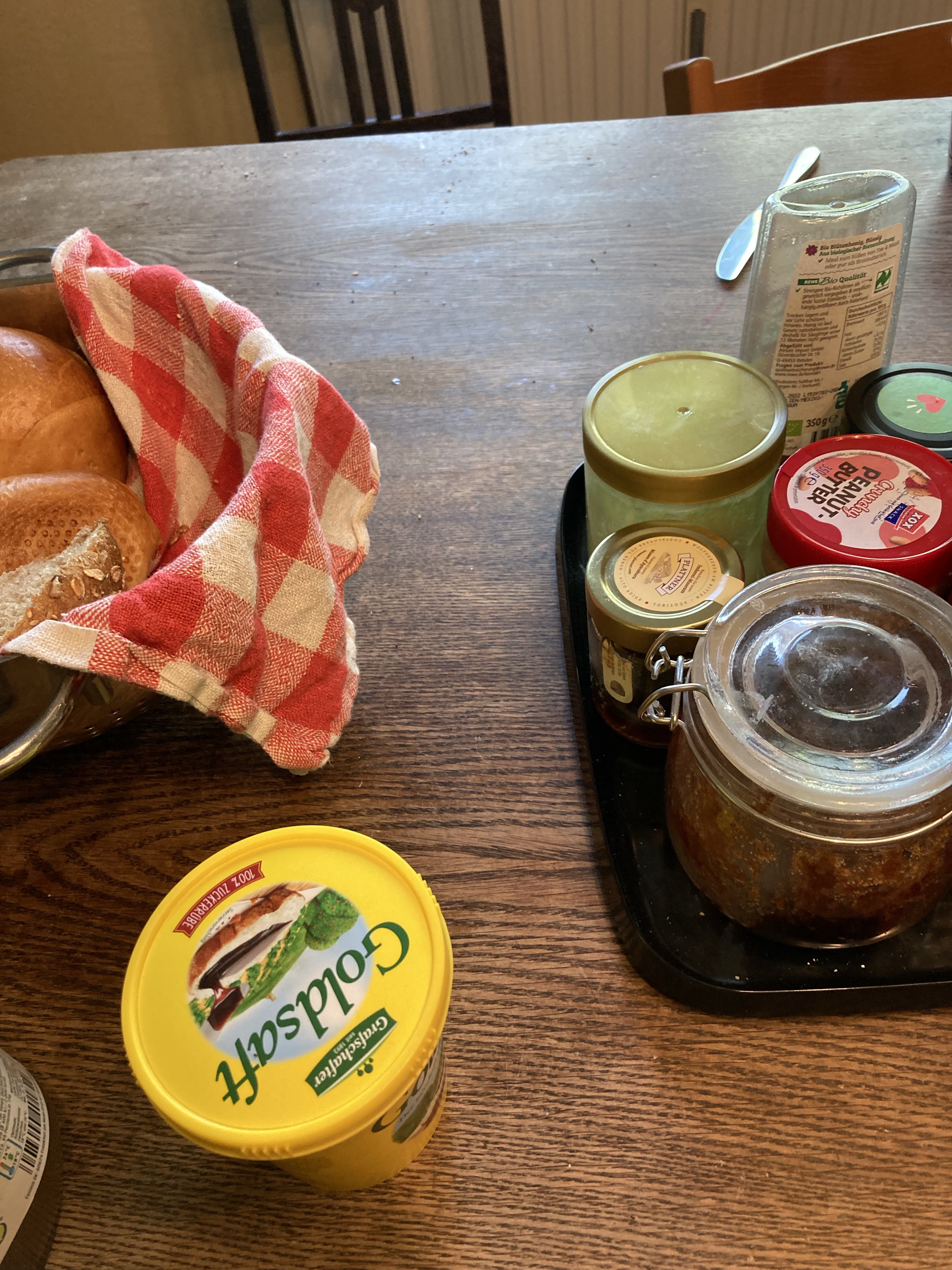 [KM:] „Ich hab auch ein Geschenk für Dich, Mama. Und ich schmier Dir jetzt Dein Brötchen. Guck mal, mit einem Herz aus Sirup!“
