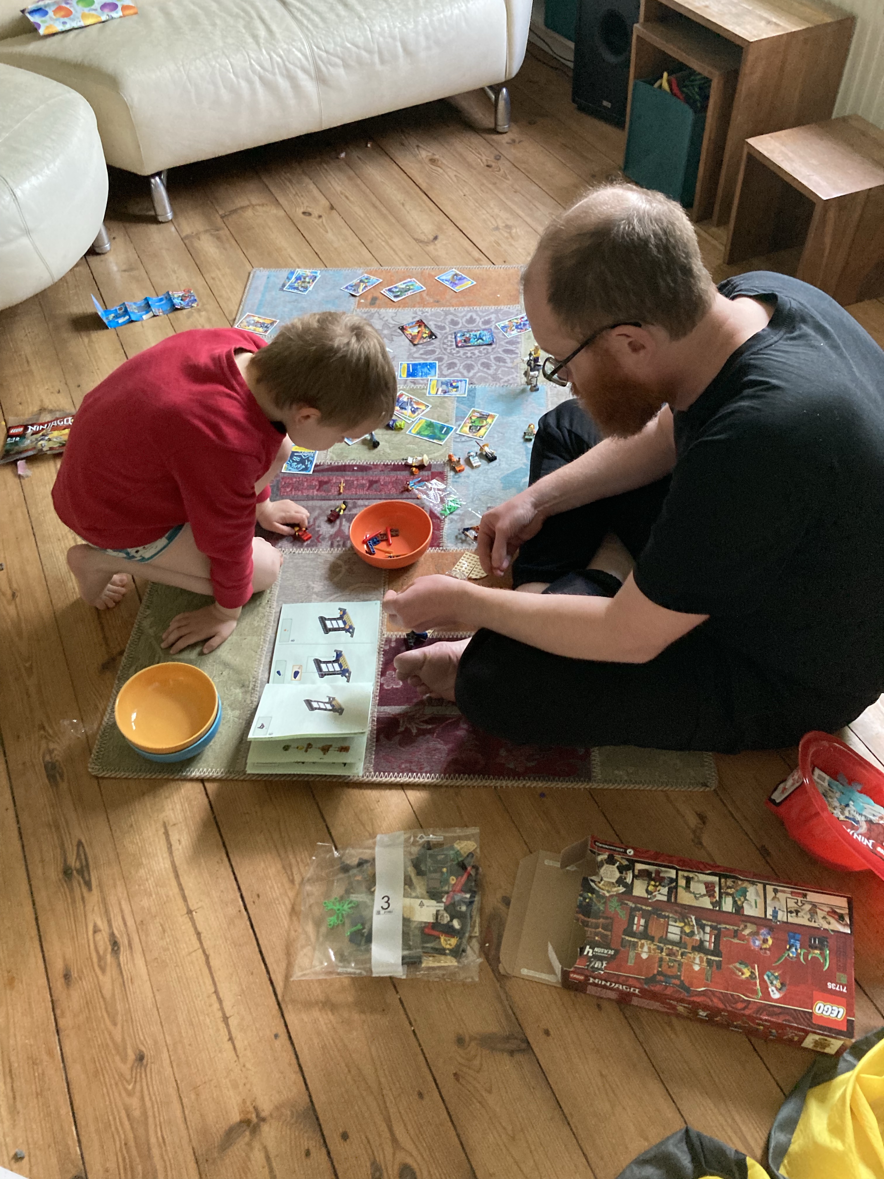 [KJ:] „Und wann baust Du mit mir das neue Lego auf, von meiner Kita-Geburtstagsfeier? Die war soooo toll. Ich wusste gar nicht, dass wir alle Feuerwehrhelme kriegen!“