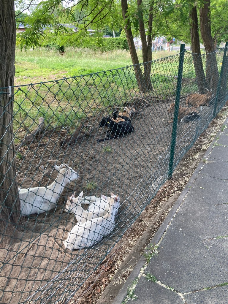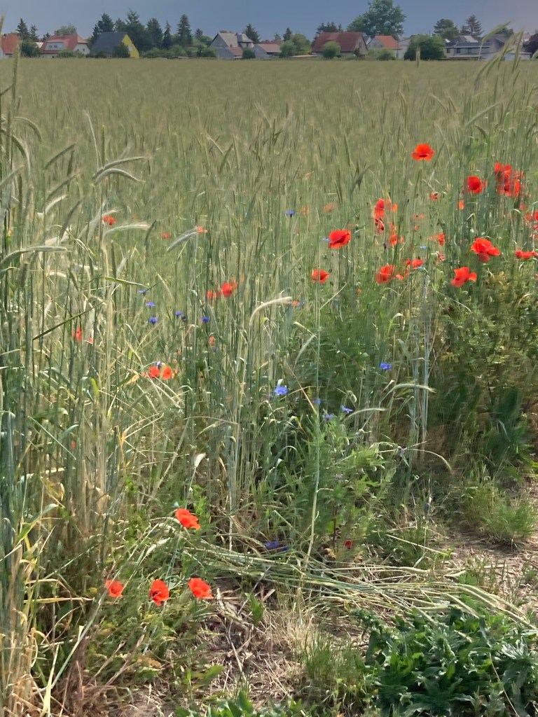[Etwas später. folienstern:] „Ach, wie schön – tatsächlich Mohnblumen und Kornblumen am Feldrand! Und Ziegen. Und schöne Bücher gab’s auch in meinem Lieblingsladen!“