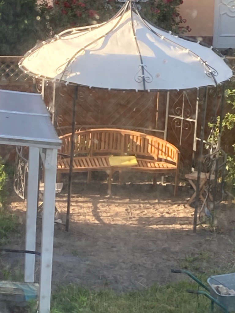 [folienstern:] „Mal sehen, ob ich jetzt die Bank zusammengebaut kriege für den Pavillon.“