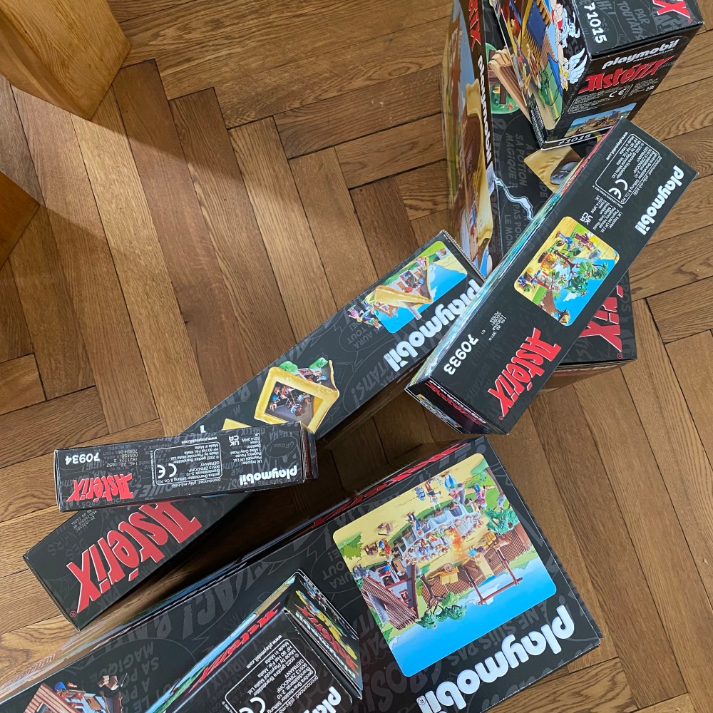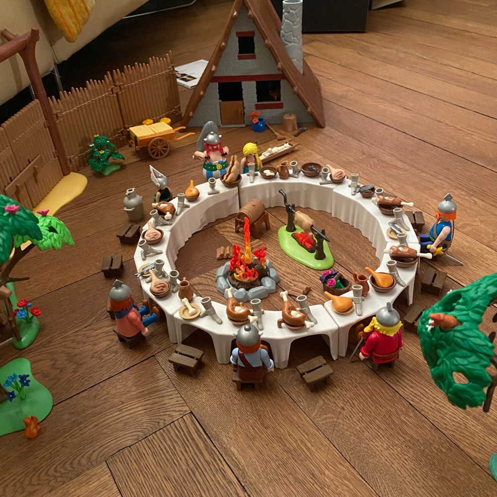[Später am Abend. GJ:] „So, fertig! Guck‘ mal, wie toll das ist! Ich weiß auch schon, wo ich die anderen Sachen hinstelle, wenn ich sie bekomme! Und ich weiß, welche Sets ich mir noch wünsche: Das Piratenschiff, die Hütte von Verleihnix und die Hütte vom Schmied!“