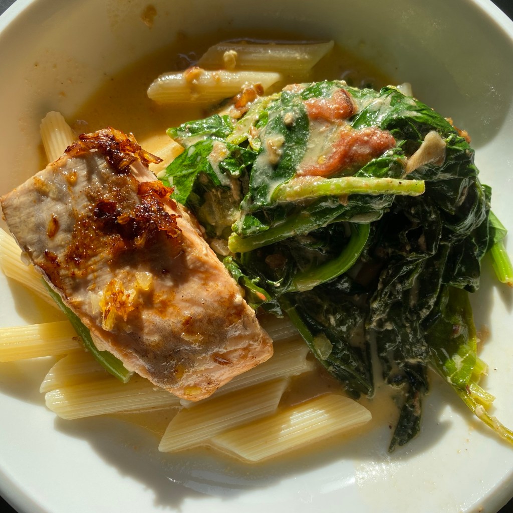 [kneteeis:] „Lachs mit Spinat-Tomaten-Sahne-Sauce. Und Pasta!“