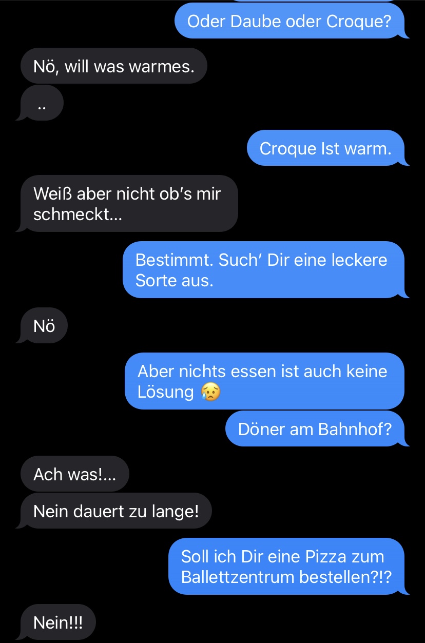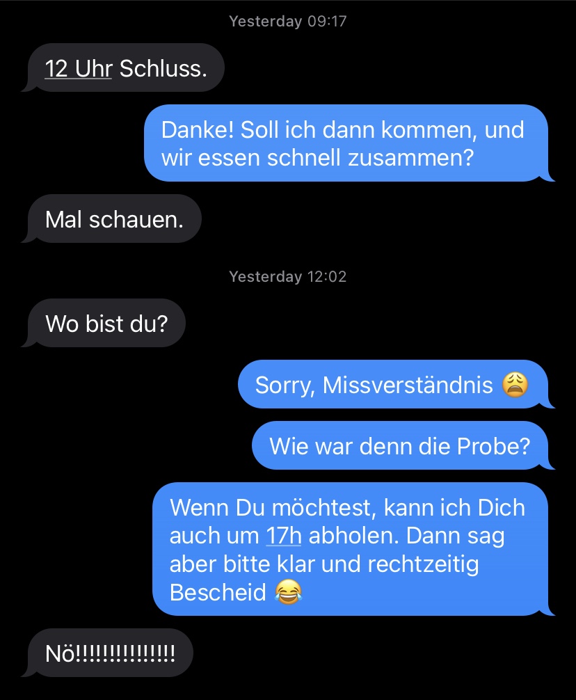 [kneteeis:] „Schick‘ mir dann bitte mal eine Nachricht, wann die Probe vorbei ist. Und wenn Du möchtest, komme ich dann, und wir können zusammen essen.“