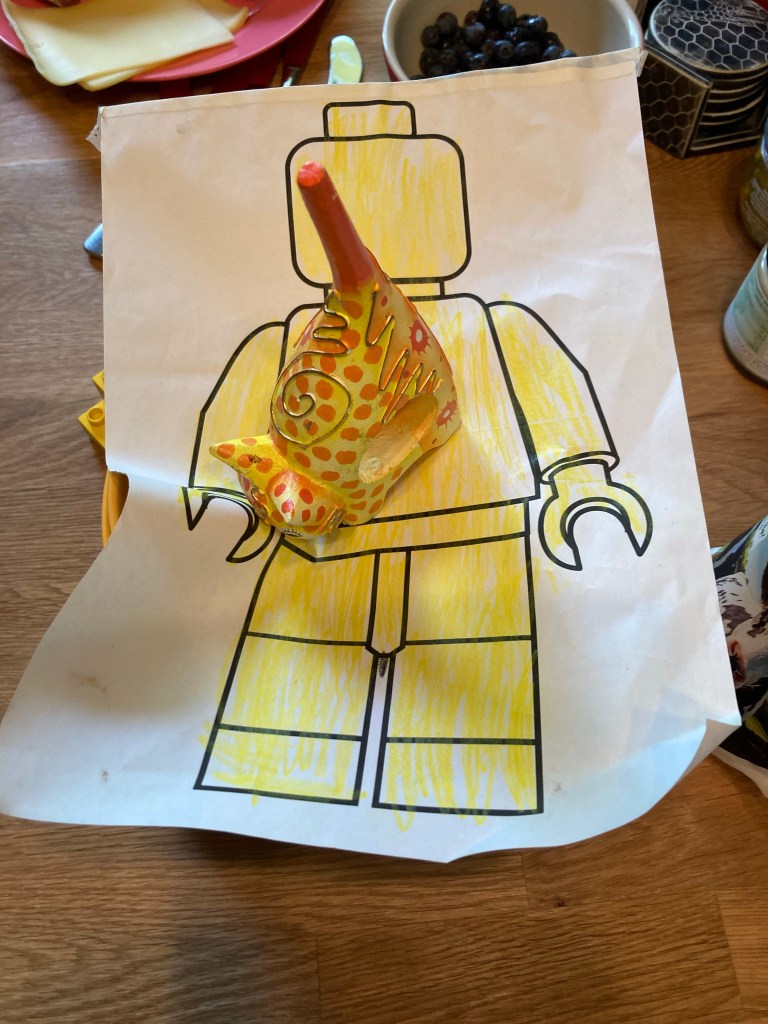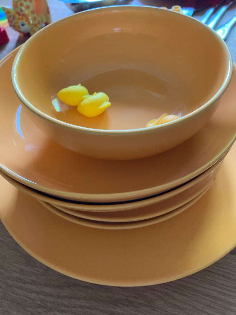 [KJ:] „Guck mal, Mama! Der Tisch wackelt kein bisschen! Und jetzt sortiere ich alle Teller darauf, und morgen früh suchen alle aus, welche Farbe sie wollen! Du nimmst Gelb, Mama, und dazu kriegst Du noch ein Legomännchen!“