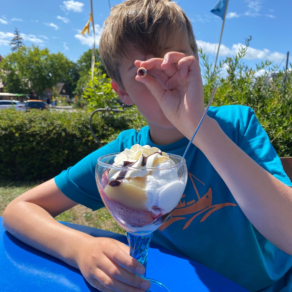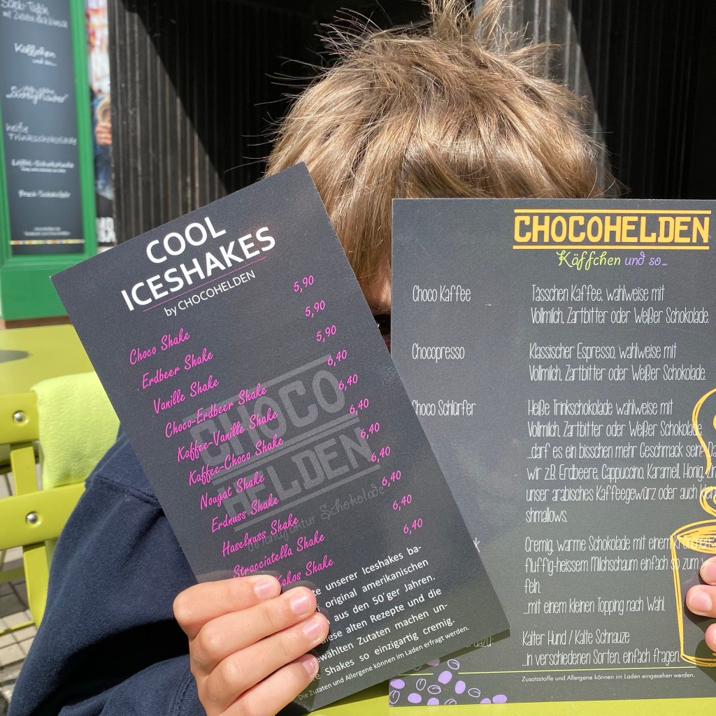 [Etwas später in Zingst. GJ:] „Ich nehme einen Schokoschlürfer mit Vollmilch und Zimt und einen mit Zartbitter und Chili!“