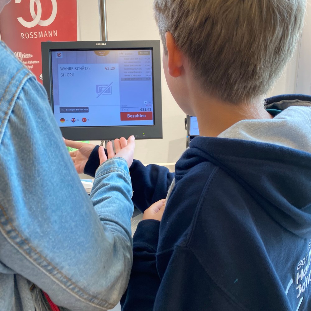 [Kurz darauf. GM, GJ:] „Oh, hier gibt es eine SB-Kasse! Komm‘, wir scannen alles ein!“