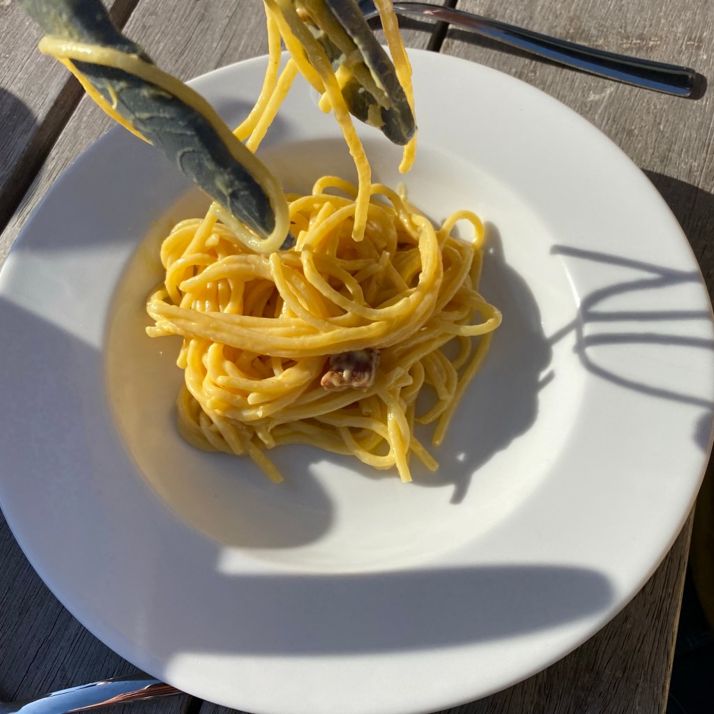 [Vater:] „Die Carbonara ist fertig! Kommt schnell essen, ehe sie kalt wird vom Wind!“