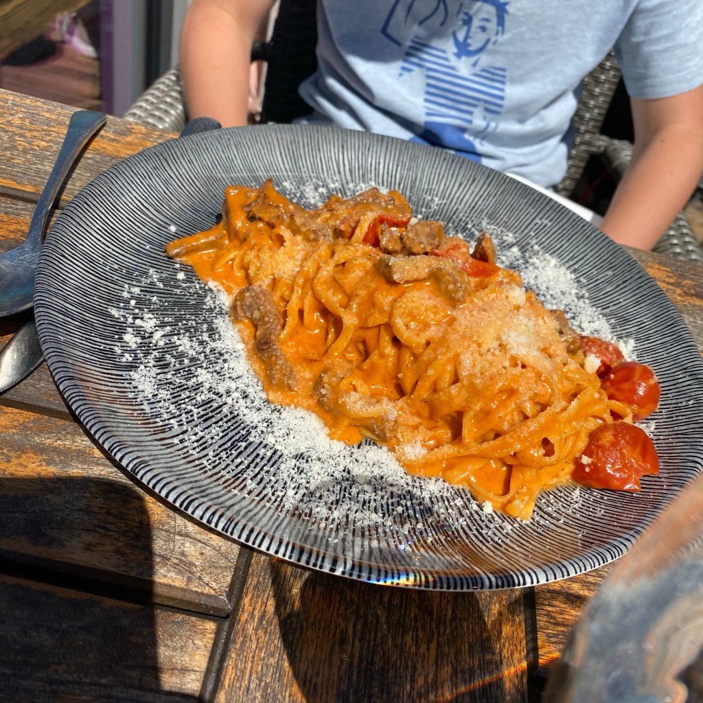 [Kurz darauf. GJ:] „Ich nehme Tagliolini mit Filetspitzen. Das nehme ich immer bei Italienern, die ich noch nicht kenne, um zu vergleichen! Und zu trinken Wasser und Rhabarberschorle.“