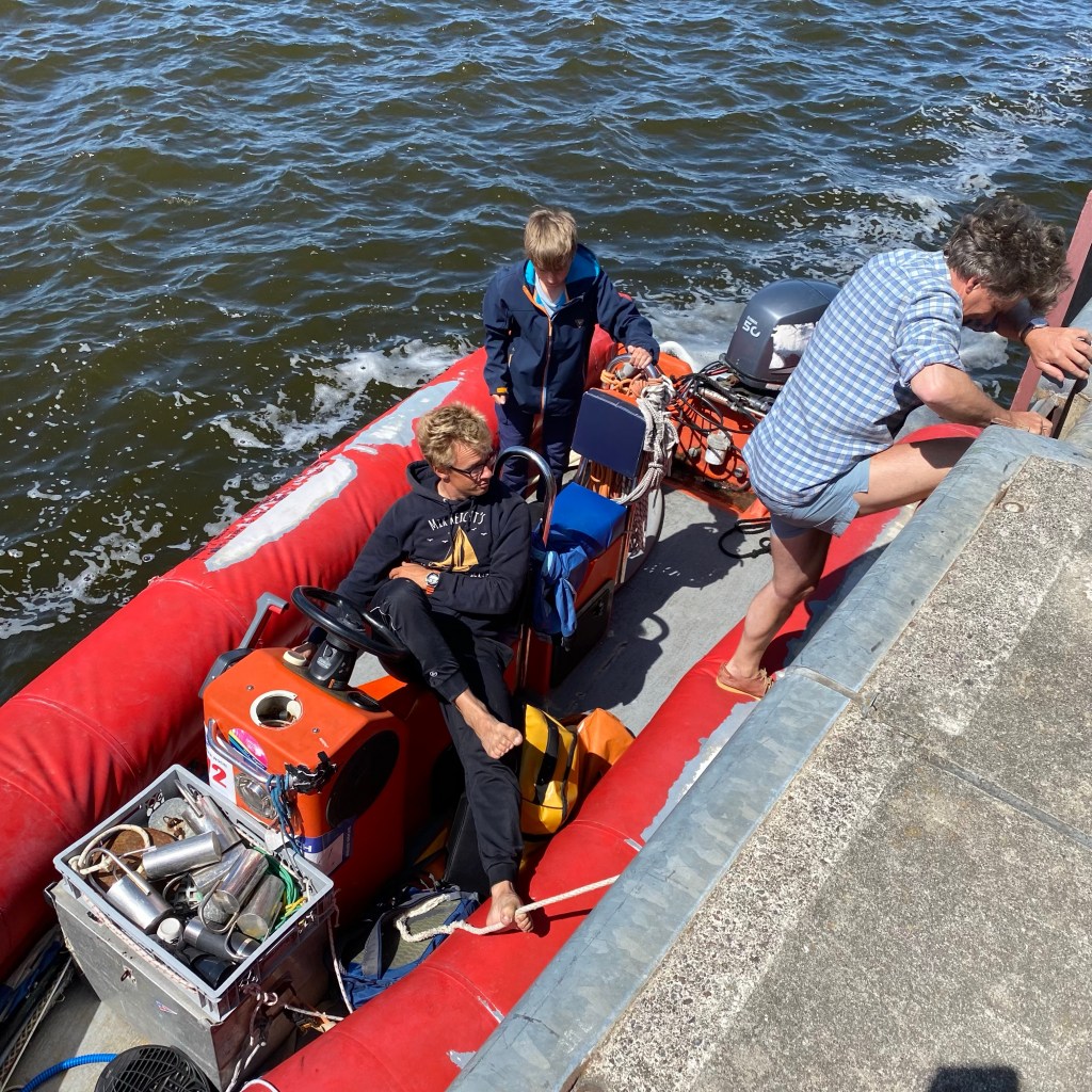 [Kurz darauf. Vater vom großen Jungen:] „Komm‘, wir steigen ein und fahren rüber zum Segelboot. Du darfst auch gleich steuern!“