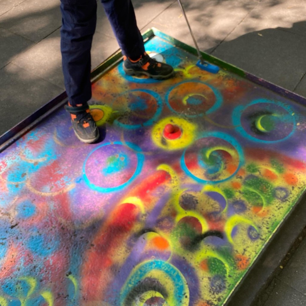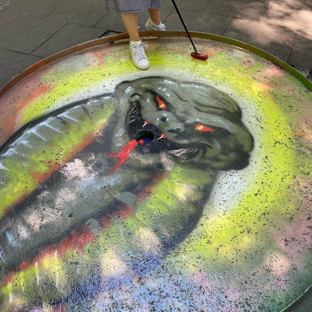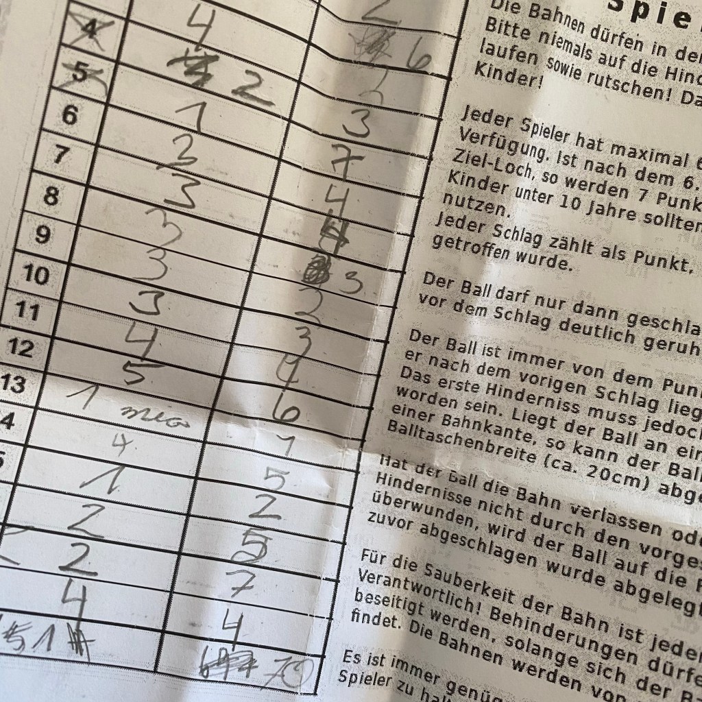 [kneteeis:] „Fand ich auch. Aber immerhin waren wir jetzt mal hier – nach dem wir an der Minigolfanlage immer vorbeilaufen, wurde das höchste Zeit. Außerdem soll das aktuell die älteste noch betriebene Minigolfanlage in Deutschland sein.“