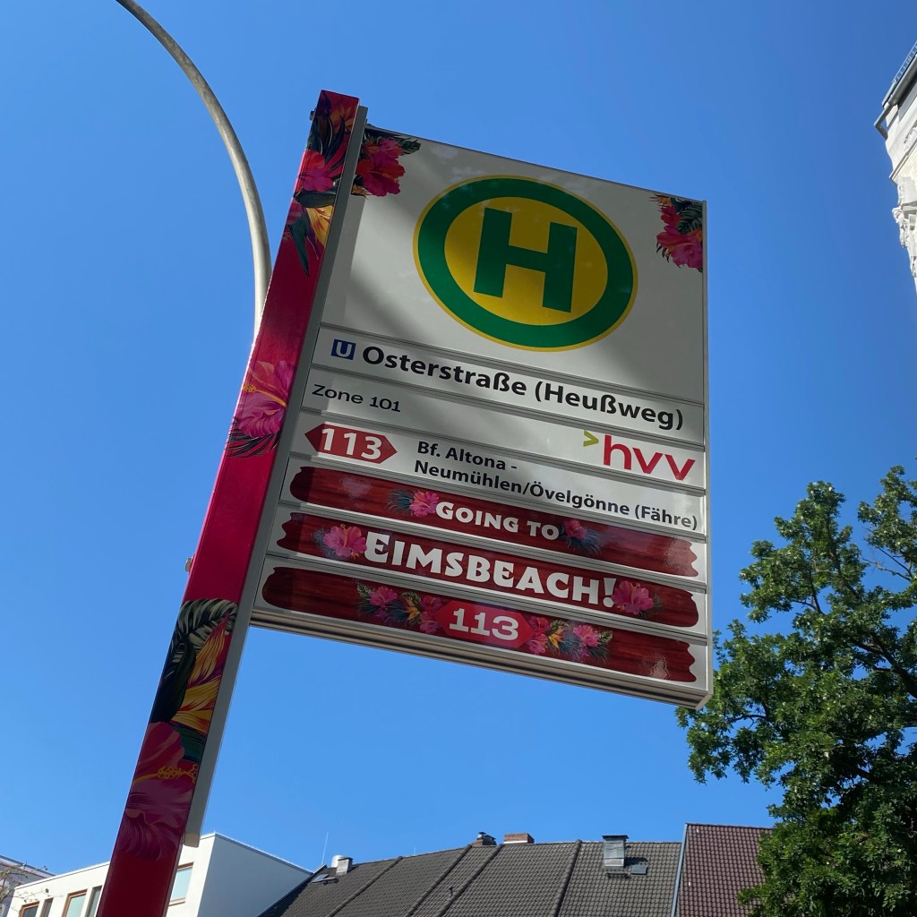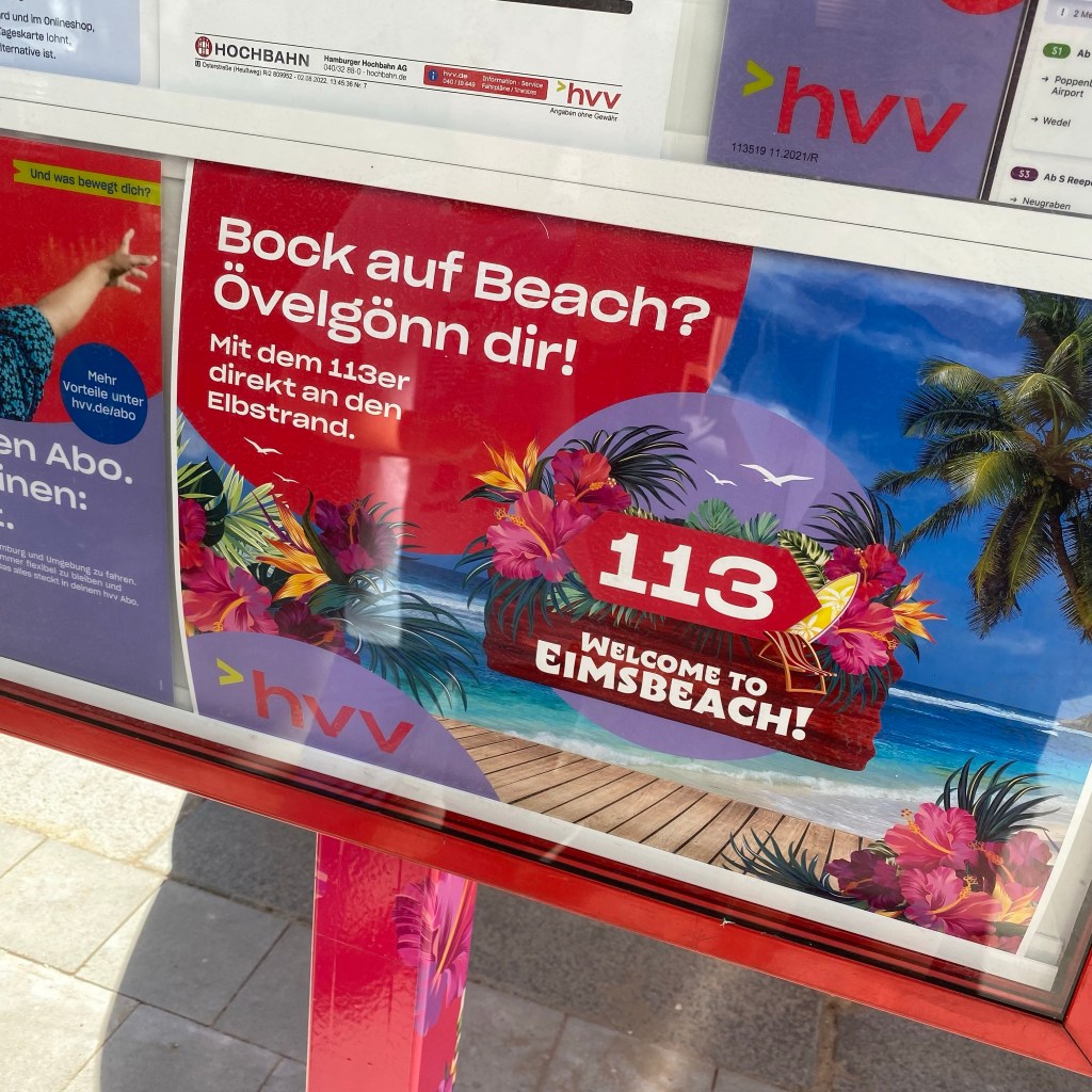 [GJ:] „Guck‘ hier: Hier fährt ab nächster Woche der neue Bus direkt bis zum Elbstrand! Dann haben wir quasi einen direkten Strandzugang vor der Haustür!“
