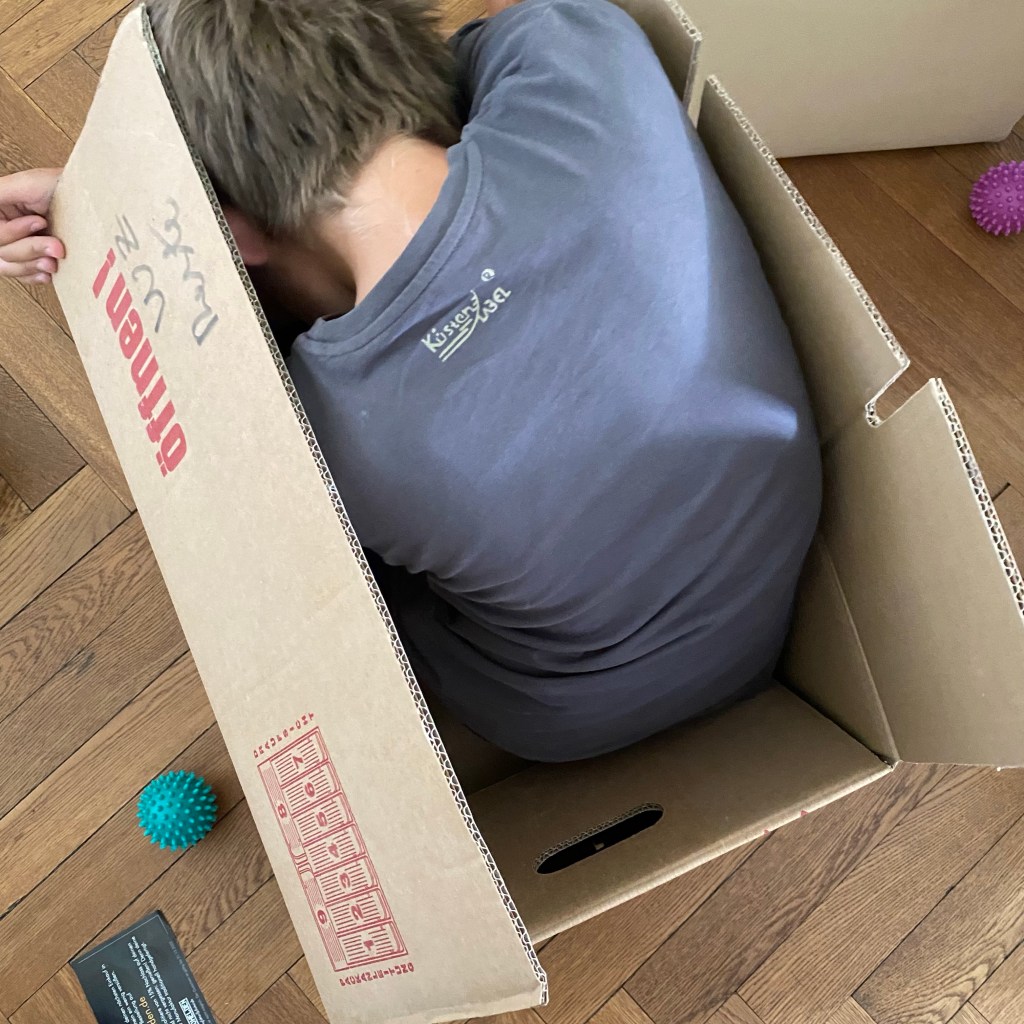 [GJ:] „Ehe ich meine Schulsachen einpacke, probiere ich mal, ob ich in die Kiste passe…“