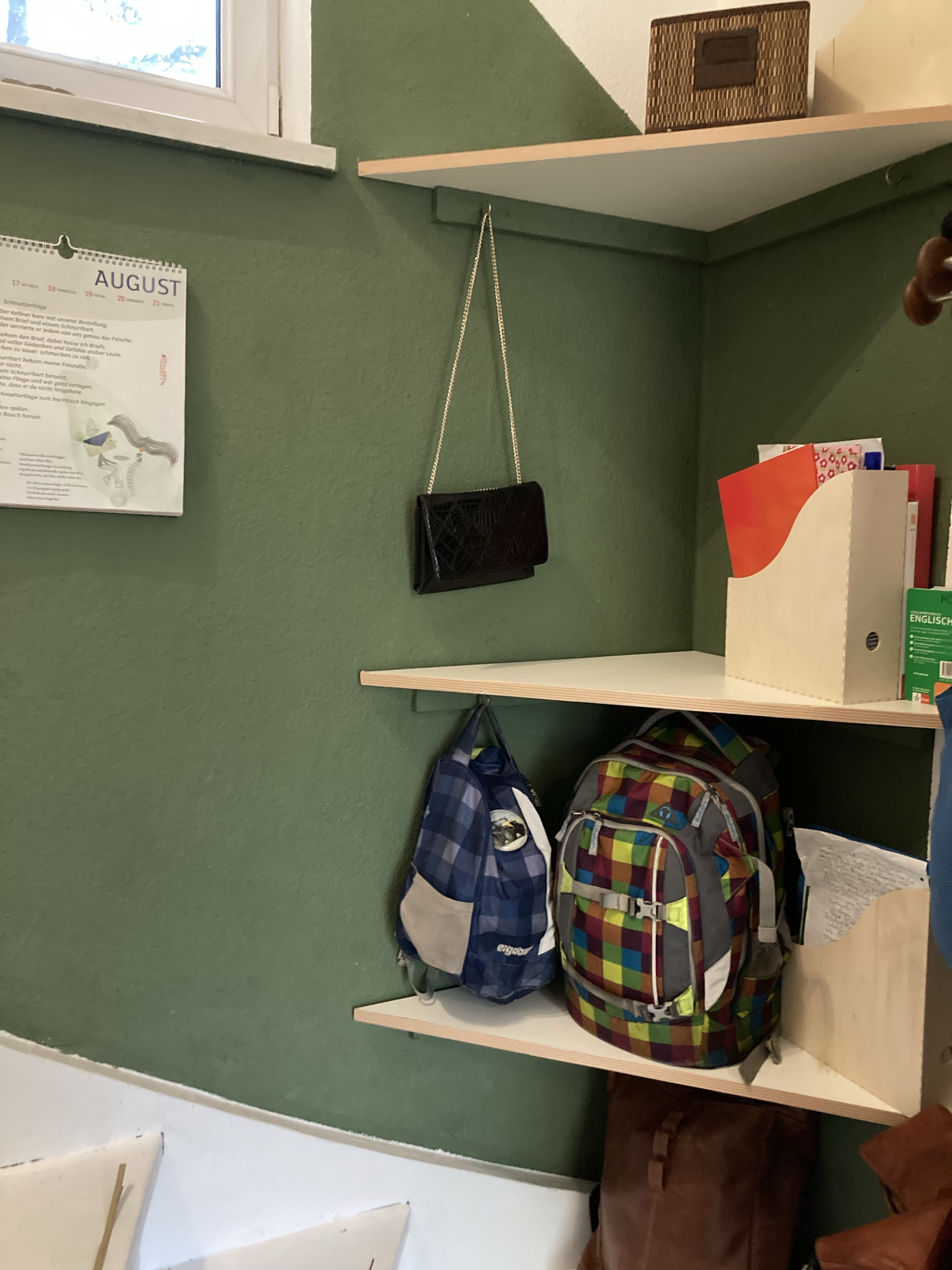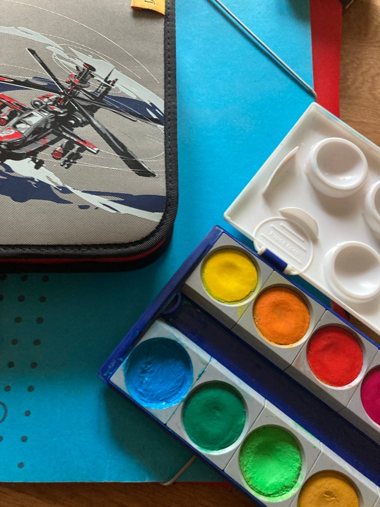 [Später am Sonntag. folienstern:] „So, noch die letzten Schulsachen fertig machen … Praktisch, dass die Kinder den gleichen Tuschkasten haben, dann können wir die Farben ergänzen.“