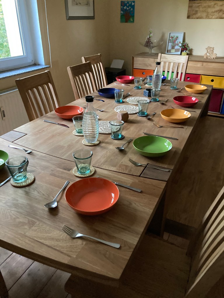 [folienstern:] „So, Tisch ist gedeckt. Wenn unsere Freunde kommen, kann es Essen geben. Die Großen fahren allerdings gleich weiter zum Konzert.“
