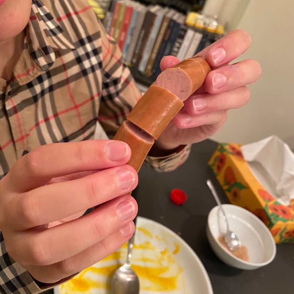 [GJ:] „Ich komme! Guck‘ mal, ich kann das Würstchen biegen!“