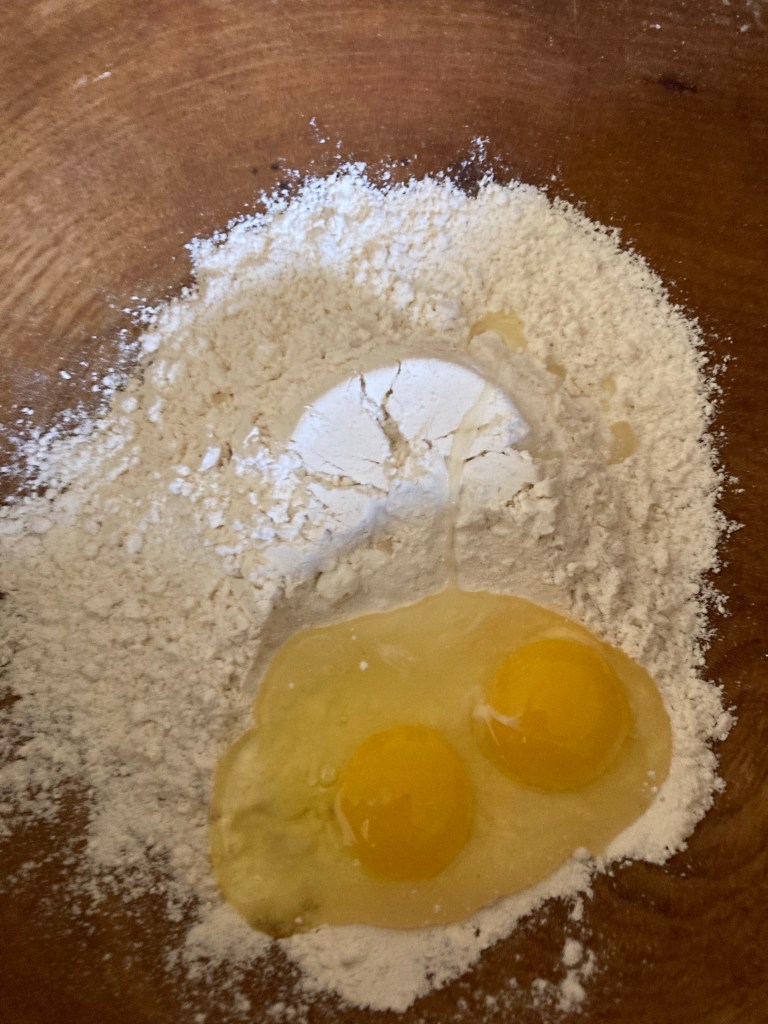 [Etwas später. folienstern:] „Ups – jetzt habe ich die Butter und die Mehl-Menge vertauscht! Dann muss ich wohl noch so viel Mehl dazutun, dass man den Teig kneten kann! Wie praktisch, dass das Ei zwei Dotter hatte!“