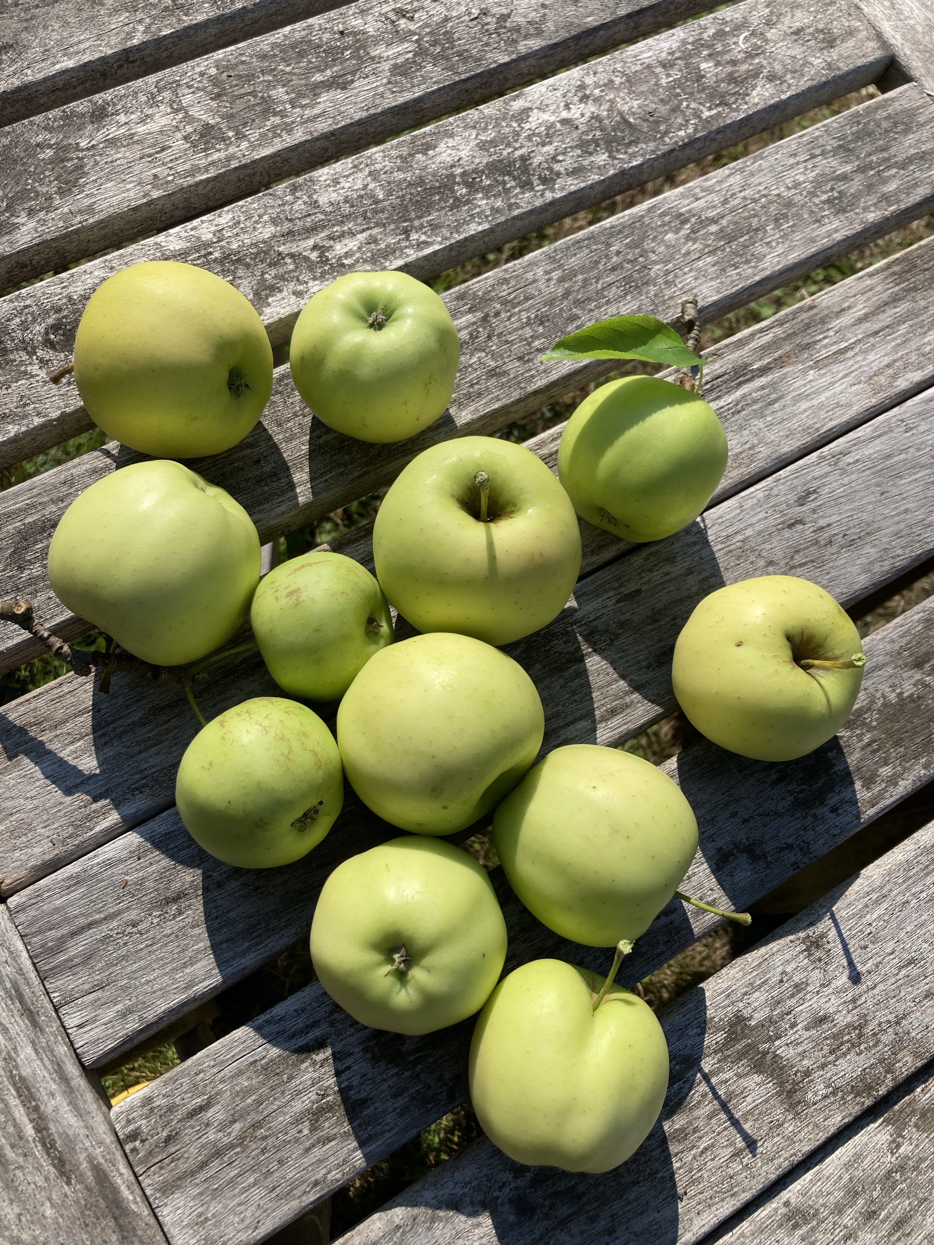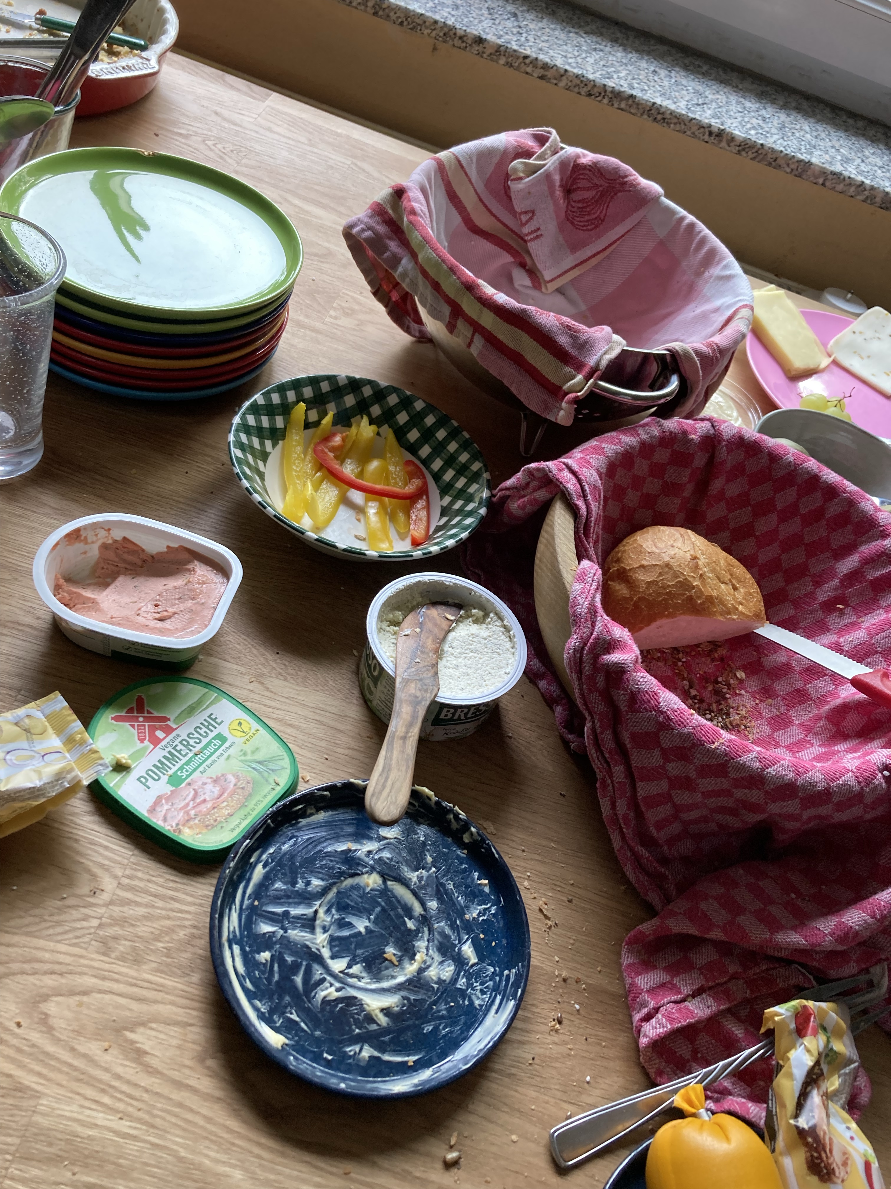 [folienstern:] „Das war jetzt echt schön gestern! Und so 20 Erwachsene und 20 Kinder. Jetzt probiere ich mal, aus dem übrigen Mehl mit Butter vom Apfelkuchen gestern Apfelpfannkuchen im Ofen zu machen.“