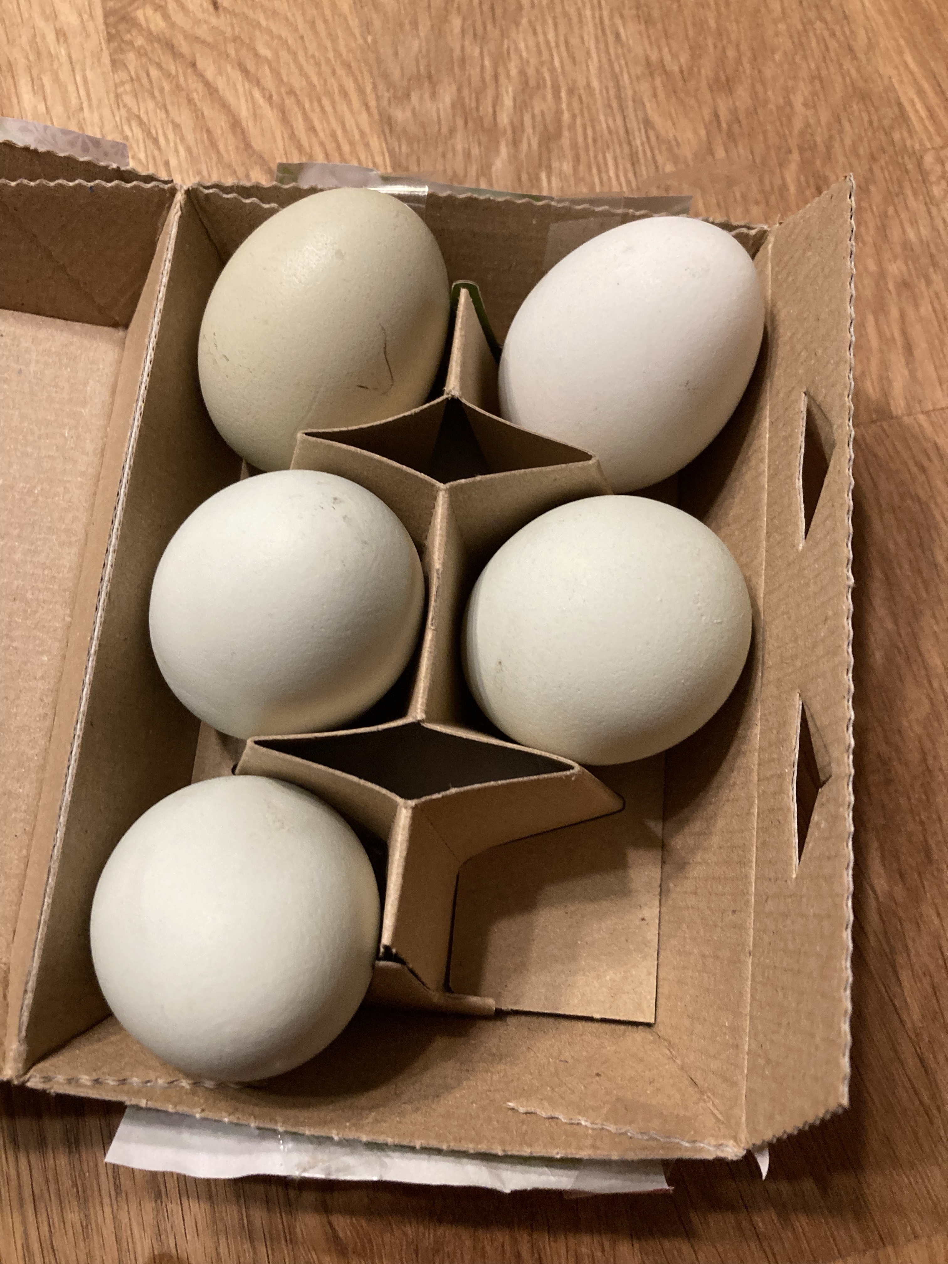 [Gäste:] „Wir haben Euch Eier mitgebracht, von unseren Hühnern.“