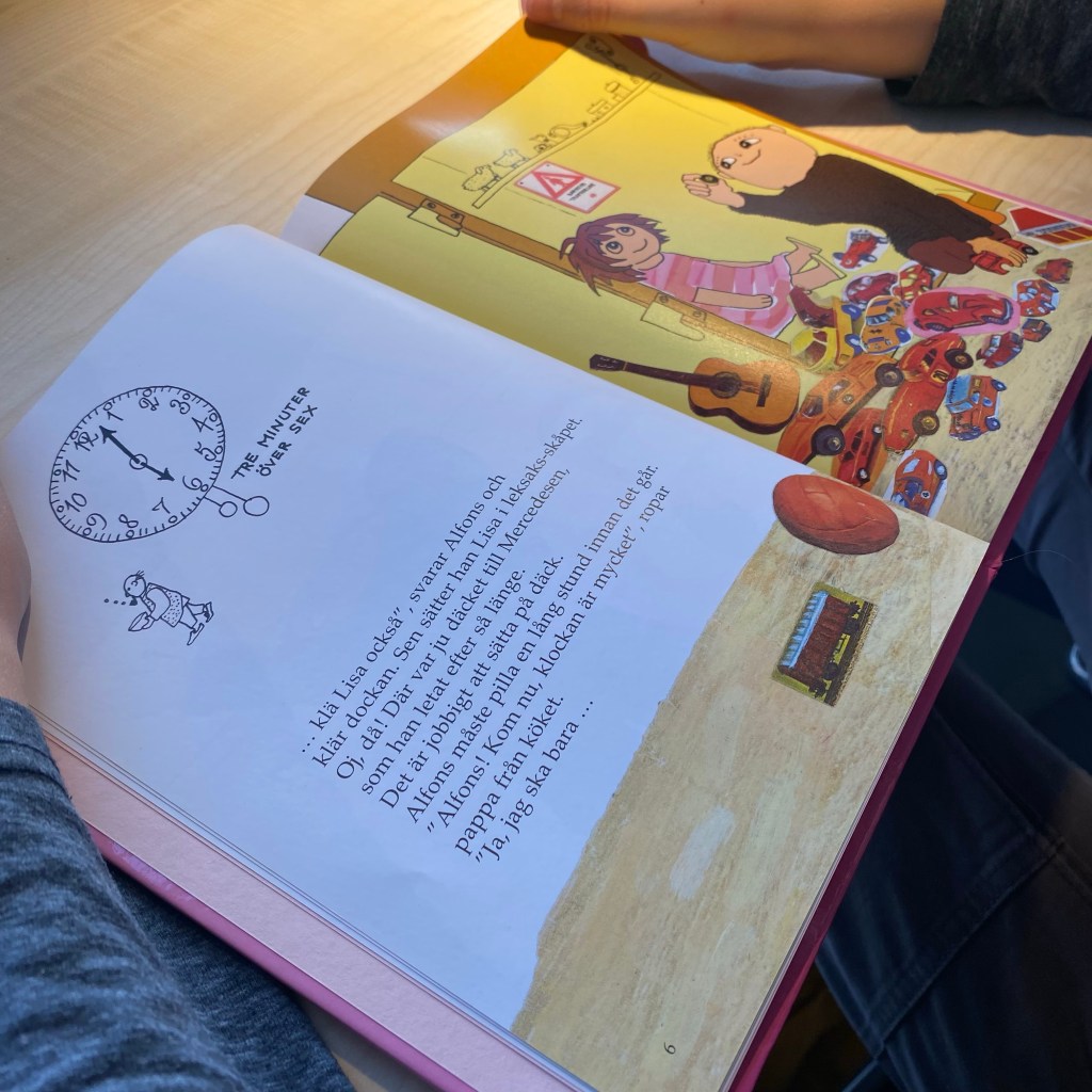 [GJ:] „Guck‘ mal: Da gibt es schwedische Willi-Wiberg-Bücher! Können wir das kaufen, wo Willi immer ‚Ich muss nur noch…‘ sagt?“