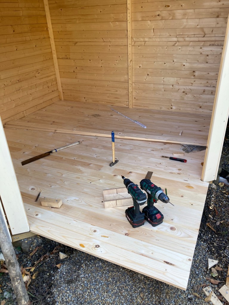 [Vater:] „Ich mache jetzt mal den Fußboden vom Gartenhaus.“
