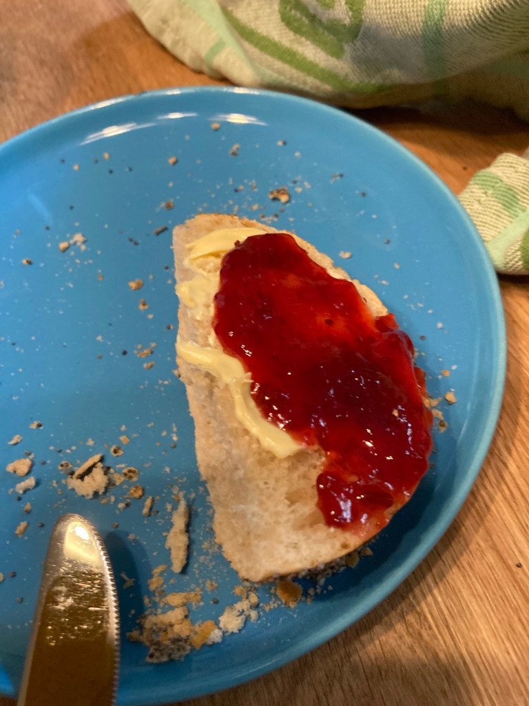 [KJ:] „Wenn ich das nächste Mal bei Opi bin, kann ich ihm verkaufen helfen, dann bessere ich mein Taschengeld auf! Und jetzt möchte ich ein halbes halbes Brötchen mit Pflaumenmarmelade.“