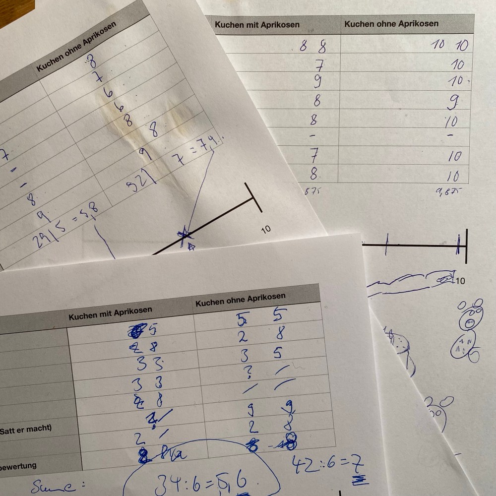 [Etwas später. kneteeis:] „Spannend: Die Backmischung hat bei uns allen ungefähr zwei Punkte besser abgeschnitten. Und Opi hat alles einfach mal zwei Punkte höher bewertet als die anderen.“