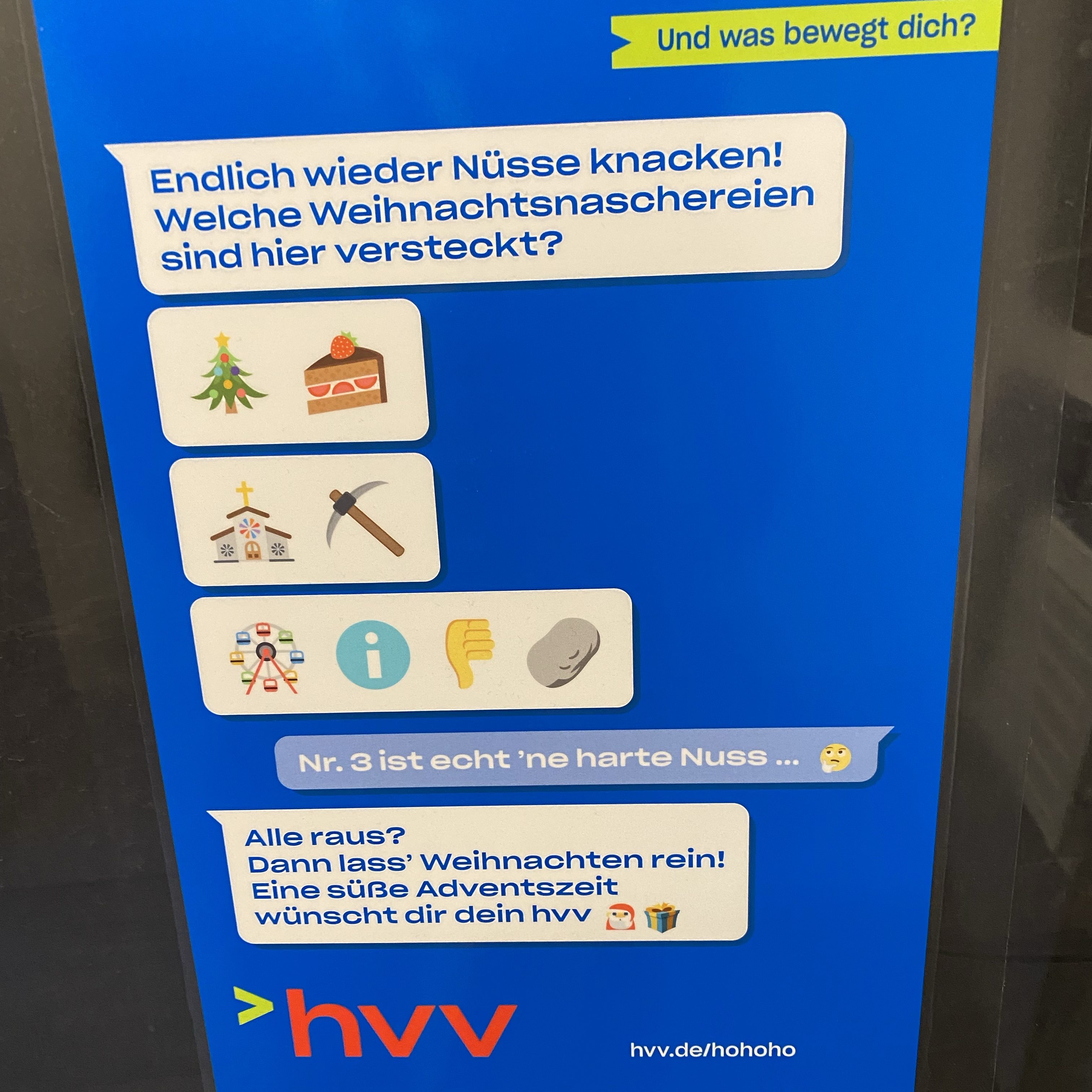 [kneteeis:] „Ach, da ist noch ein Weihnachtsrätsel vom hvv, das wir noch nicht kannten. Ich mache mal ein Foto für den großen Jungen…“