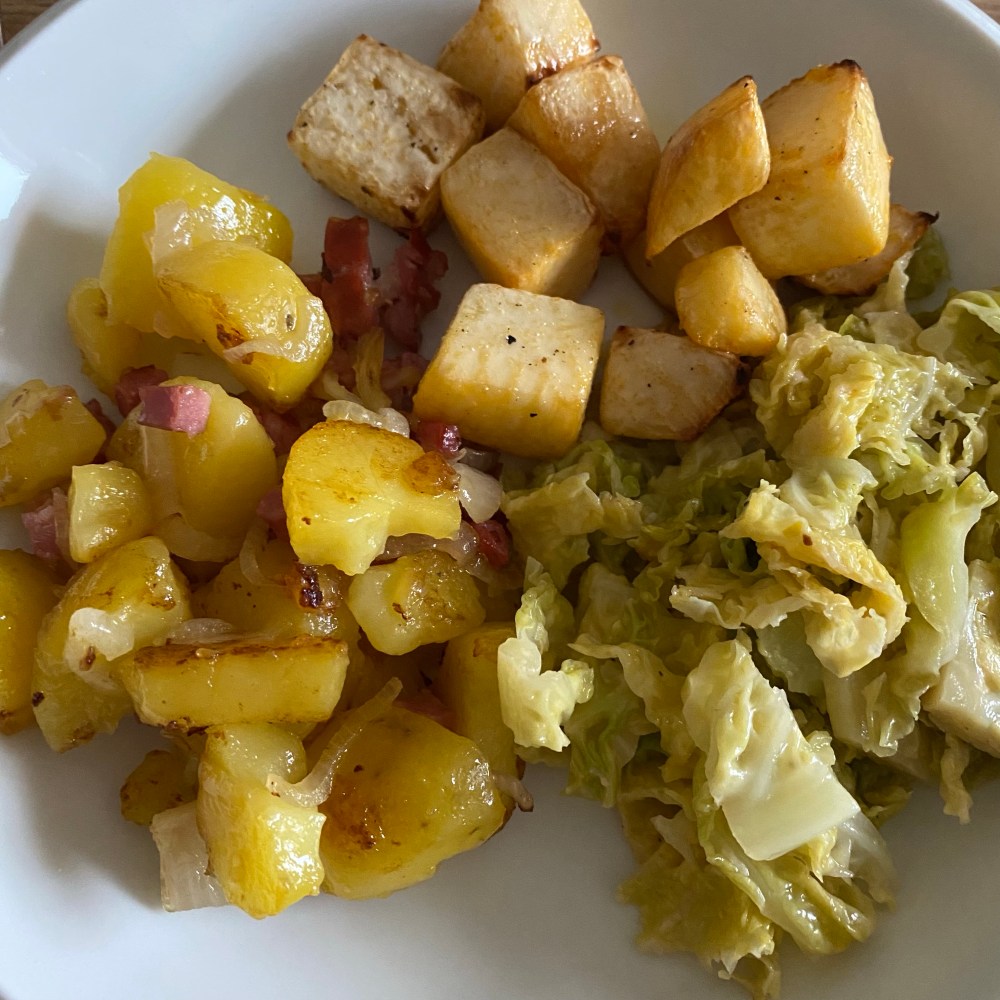 [kneteeis:] „Heute gibt es viel Gemüse: Wirsing mit Knoblauch-Sahne-Sauce und Steckrübe aus dem Ofen und Bratkartoffeln mit Zwiebeln und Speck.“